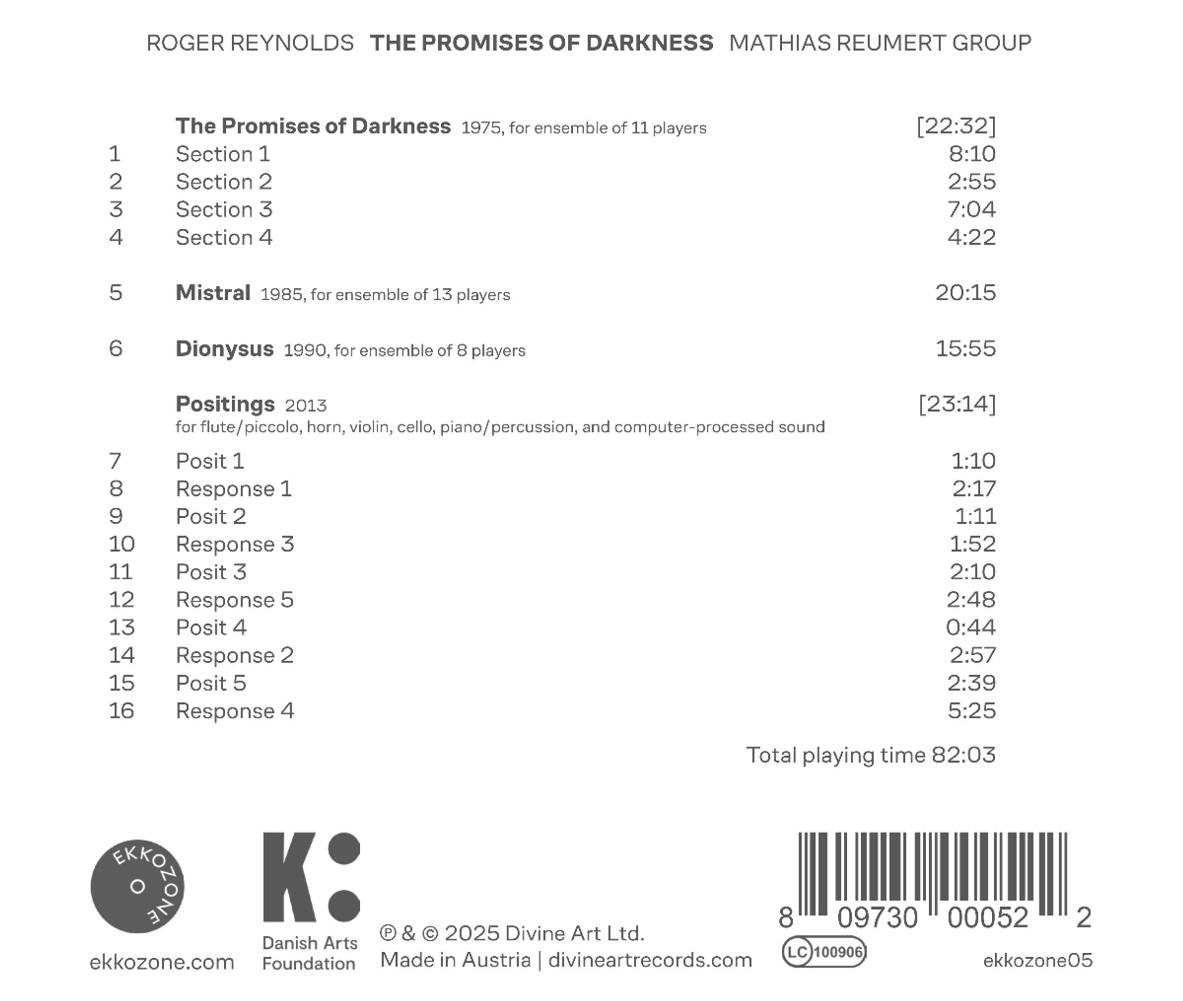 „The Promises of Darkness“ markiert das nächste Kapitel in der Zusammenarbeit des mit dem Pulitzer-Preis ausgezeichneten Komponisten Roger Reynolds mit dem Dirigenten und Produzenten Mathias Reumert. Dieses Album, das von Ekkozone veröffentlicht wurde, präsentiert Welturaufführungen von vier Hauptwerken, die vier Jahrzehnte von Reynolds' Beiträgen zur zeitgenössischen Musik nachzeichnen. Das Titelwerk „The Promises of Darkness“ (1975) ist eine Hommage an Reynolds' Mentor Roberto Gerhardt. Das für ein Ensemble von 11 Spielern komponierte Stück zaubert meisterhaft lebendige Farben und ein fast filmisches Gefühl des Grauens hervor. Aus dem Jahr 1985 stammt „Mistral“ für Streicher, Blechbläser und verstärktes Cembalo. „Mistral“ wurde bereits in einer Live-Aufnahme in Lo-Fi veröffentlicht, aber die hochentwickelte Partitur – mit ihrem kristallklaren, artikulierten Cembalo – wird in dieser neuen Version, endlich angemessen zum Leben erweckt. „Dionysus“ (1990) stellt eine ‚Mischung aus Metapher und Pragmatik‘ dar, die in einer präzisen Darbietung mit ausdrucksstarken Soli der Flötistin Hélène Navasse und des Trompeters László Molnár eingefangen wird. Den Abschluss des Albums bildet das elektroakustische „Positings“ (2013), bei dem die Mathias Reumert Group von dem Computermusiker und Reynolds-Mitarbeiter Paul Hembree unterstützt wird. „Positings“ verbindet Live-Performance nahtlos mit elektronischen Texturen und verkörpert Reynolds' Innovationsgeist, indem es die Grenzen von Klang und Struktur erweitert. Diese Veröffentlichung folgt auf die von der Kritik gefeierten Wind Concertos, das erste Album der Reynolds / Reumert-Reihe, das 2024 von der Dänischen Rundfunkgesellschaft als Album des Jahres (The Five Best) ausgezeichnet wurde.