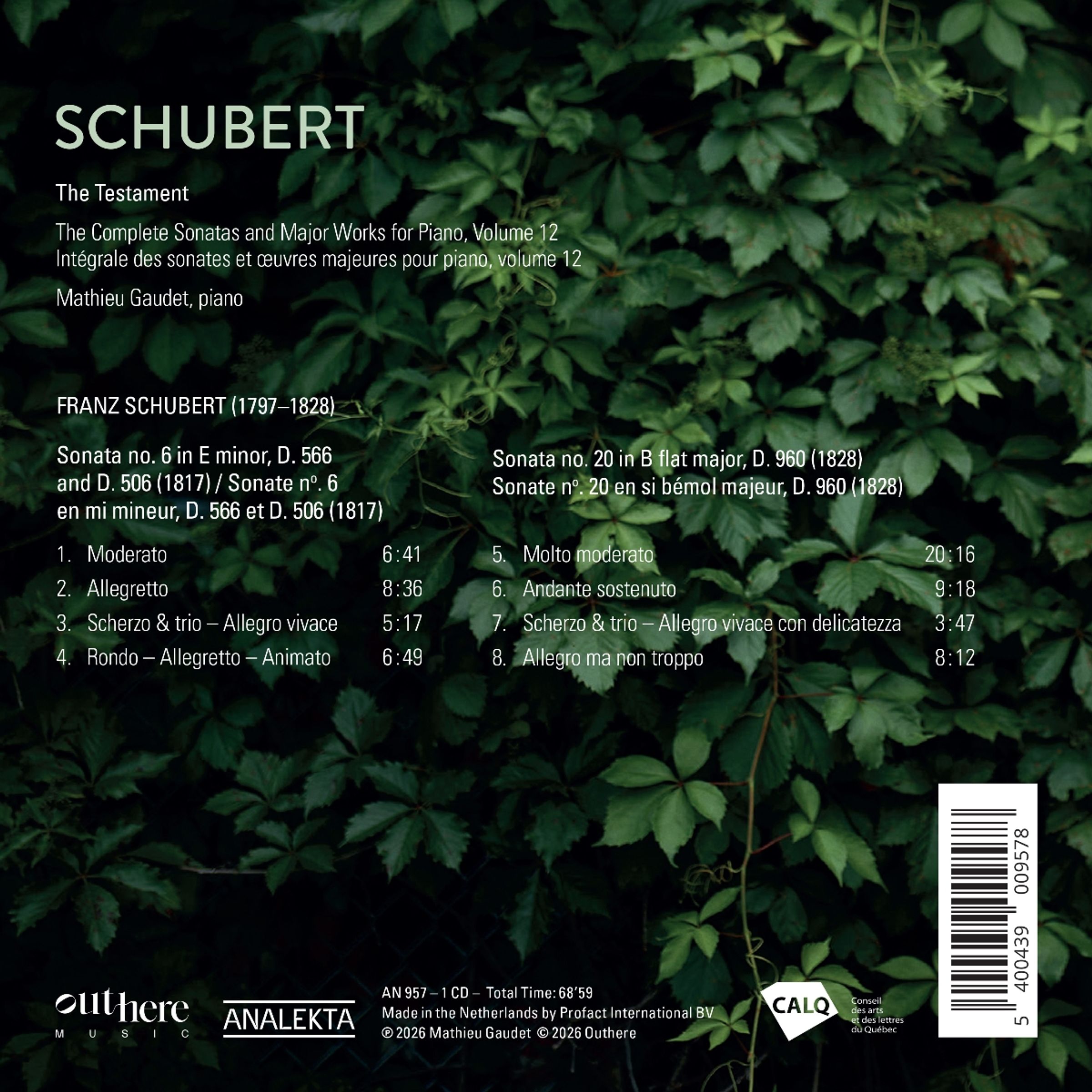 Der Pianist Mathieu Gaudet präsentiert den letzten Teil seiner Aufnahmeserie "Complete Schubert Sonatas and Major Piano Works". Diese letzte Folge, "The Testament", enthält die allerletzte Sonate von Schubert B-Dur, D. 960, ein Werk mit einer einzigartigen Klangwelt, das - üppig und doch bescheiden, leidenschaftlich und doch geduldig - die Tür zu einer Welt voller Sensibilität öffnet. Ebenfalls auf diesem Album zu finden ist die Sonate e-Moll, D. 566, geschrieben von einem romantischen 20-Jährigen, voller lustiger Ideen und Genie-Streichen.
