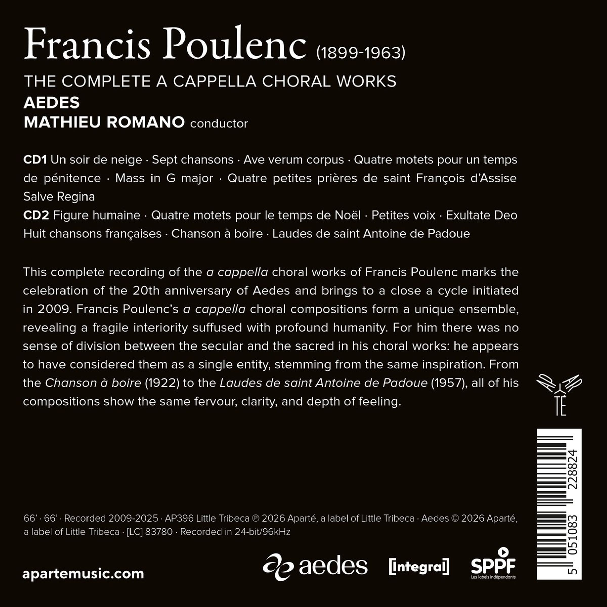 Die vollständige Aufnahme der A-cappella-Chorwerke von Francis Poulenc markiert das 20-jährige Jubiläum des Ensemble Aedes und schließt einen 2009 begonnenen Zyklus ab. Diese Werke bilden ein einzigartiges Ensemble, das eine fragile Innerlichkeit offenbart, die von tiefer Menschlichkeit durchdrungen ist. Für Poulenc gab es in seinen Chorwerken keine Trennung zwischen Weltlichem und Sakralem: Er scheint sie als eine Einheit betrachtet zu haben, die aus derselben Inspiration hervorgegangen ist. Von der Chanson à boire (1922) bis zu den Laudes de saint Antoine de Padoue (1957) zeugen alle seine Kompositionen von derselben Leidenschaft, Klarheit und Gefühlstiefe.