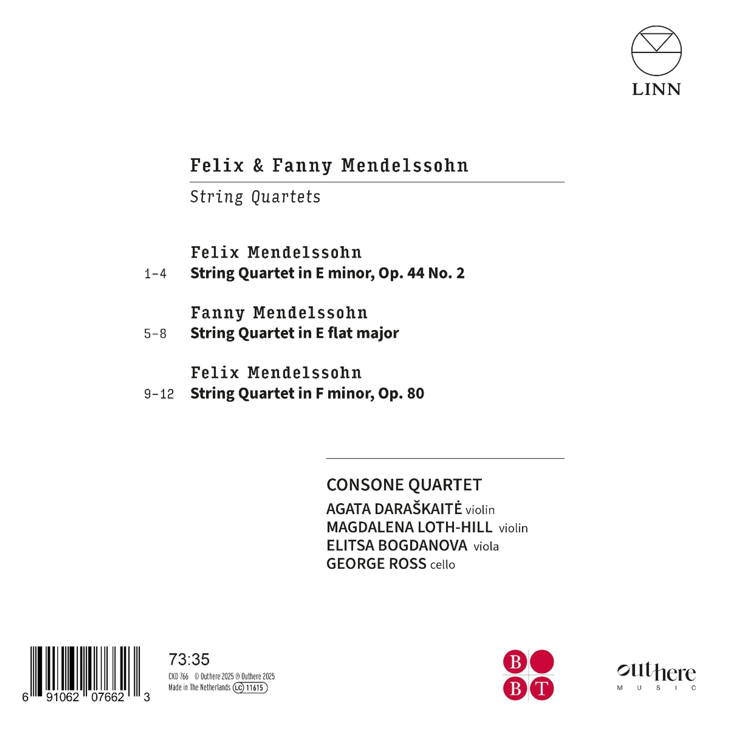 Das Consone Quartet setzt seine Erkundung der Streichquartette von Felix Mendelssohn fort und wendet sich im zweiten Teil des Zyklus auch dem einzigen Werk zu, das Fanny Mendelssohn zu diesem Genre beigetragen hat. Trotz seines leidenschaftlich bewegten Charakters entstand Felix' Streichquartett e-Moll op. 44 Nr. 2 drei Monate nach seiner Heirat - in einer Phase persönlicher Stabilität und kreativen Aufschwungs. Ganz im Gegensatz dazu steht das Streichquartett f-Moll op. 80, das er nach dem plötzlichen Tod seiner Schwester schrieb - erschüttert und traumatisiert. Es ist ein Werk von auffallender Bitterkeit und innerer Unruhe - ein schonungsloser Ausdruck seines seelischen Ausnahmezustands. Fannys Streichquartett Es-Dur ist ein ansprechendes, sorgfältig gearbeitetes Werk, das zu ihren Lebzeiten unveröffentlicht blieb - nicht zuletzt, weil ihre Familie ihr eine Komponistenkarriere ausredete. Erst 1988 wurde es posthum publiziert. Das Consone Quartet, das als erstes Originalklang-Streichquartett in das BBC-Programm New Generation Artists aufgenommen wurde, verleiht diesem Werk eine lebendige, eindrucksvolle Stimme.