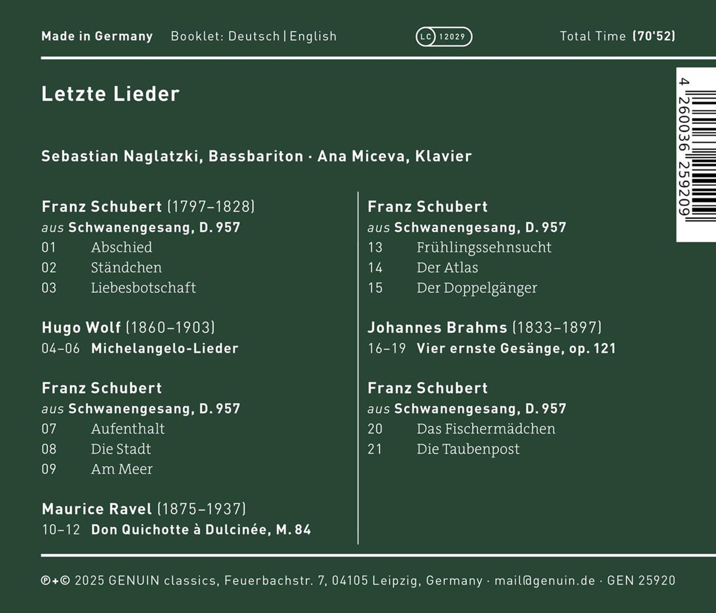 Der Artikel Franz Schubert (1797-1828): Letze Lieder wurde in den Warenkorb gelegt.
