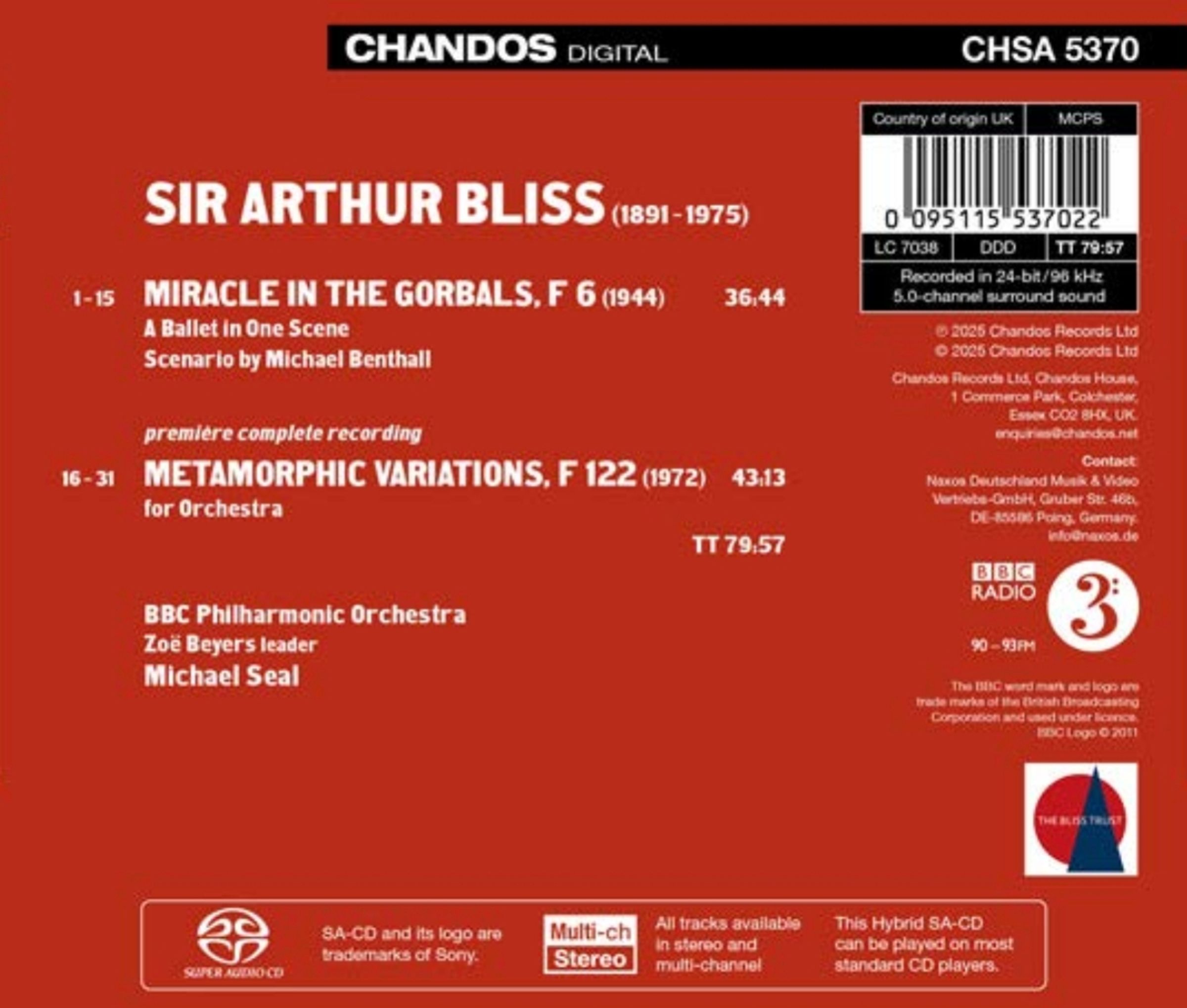 Bliss’ Partitur bedient sich einer Vielzahl von Stilen und harmonischen Ausdrucksmitteln und nutzt außerdem Leitmotive für die Hauptfiguren. Bliss’ »Metamorphic Variations«, ursprünglich unter dem Titel »Variations for Orchestra« bekannt, entstanden gegen Ende seines Lebens während einer späten Schaffensphase. Zwei der 16 Sätze wurden bei der Uraufführung (durch das LSO und Vernon Handley im Jahr 1973) gestrichen und aus irgendeinem Grund bei keiner der späteren Aufführungen des Werks wieder aufgenommen, bis Michael Seal und das BBC Philharmonic sie im Februar 2025, einen Tag vor dieser Aufnahme, wieder ins Programm aufnahmen.
