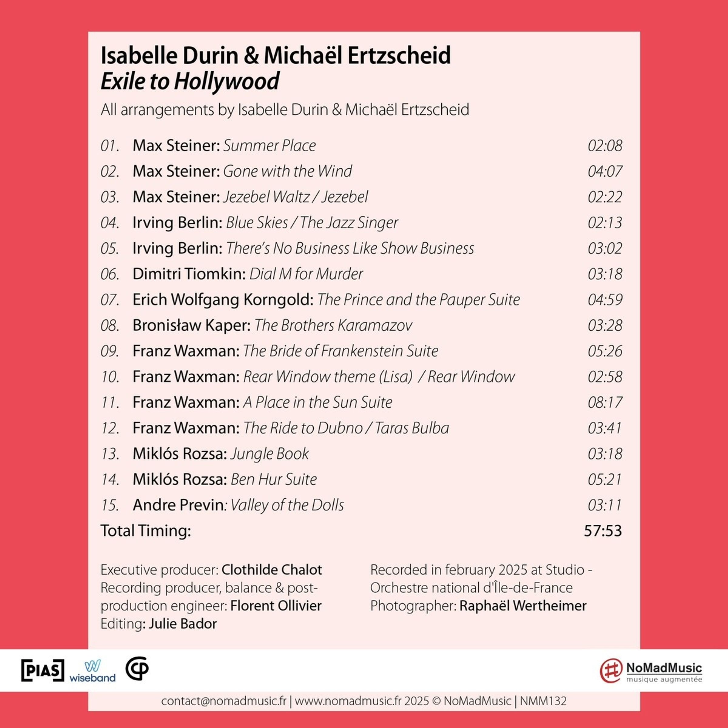 „Exile To Hollywood“ beleuchtet das Goldene Zeitalter der Filmmusik anhand des Schicksals europäischer Komponisten, die ins Exil gezwungen wurden und später den Hollywood-Sound prägten. Isabelle Durin und Michaël Ertzscheid erwecken diese sinfonische Tradition zum Leben, wo postromantisches Erbe auf Jazz und amerikanische Moderne trifft – hier subtil für Violine und Klavier transponiert. Von Korngold bis Steiner, von Waxman bis Rózsa zelebriert das Album eine Musik der Freiheit, des interkulturellen Austauschs und der Widerstandsfähigkeit.