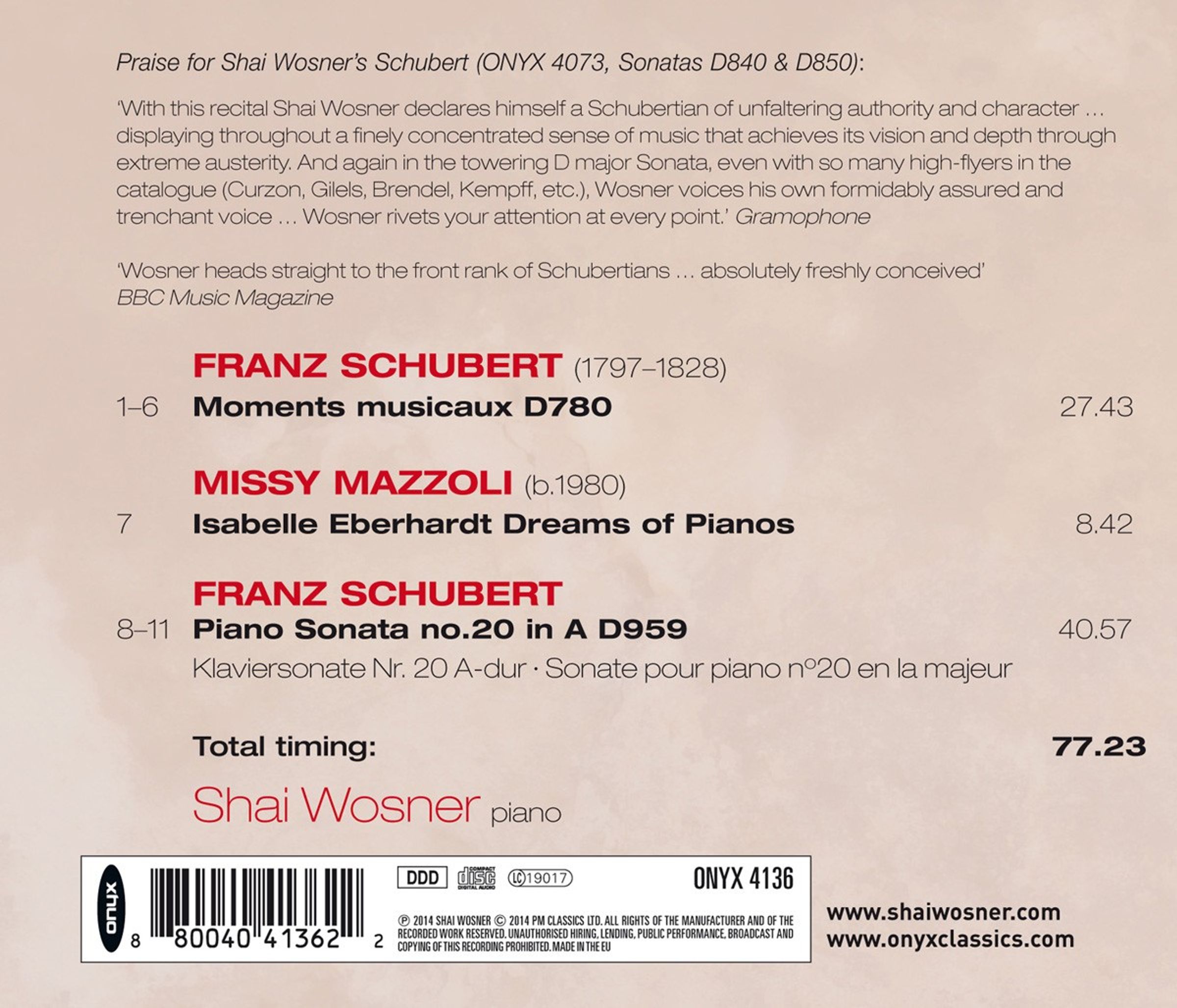 Wosner spürt diesem Zeitphänomen in seiner Einspielung auf ONYX nach und liefert eine unbedingt hörenswerte Schubert-Interpretation ab. Missy Mazzolis von Schubert inspiriertes Stück ist eine reizvolle Programmergänzung.