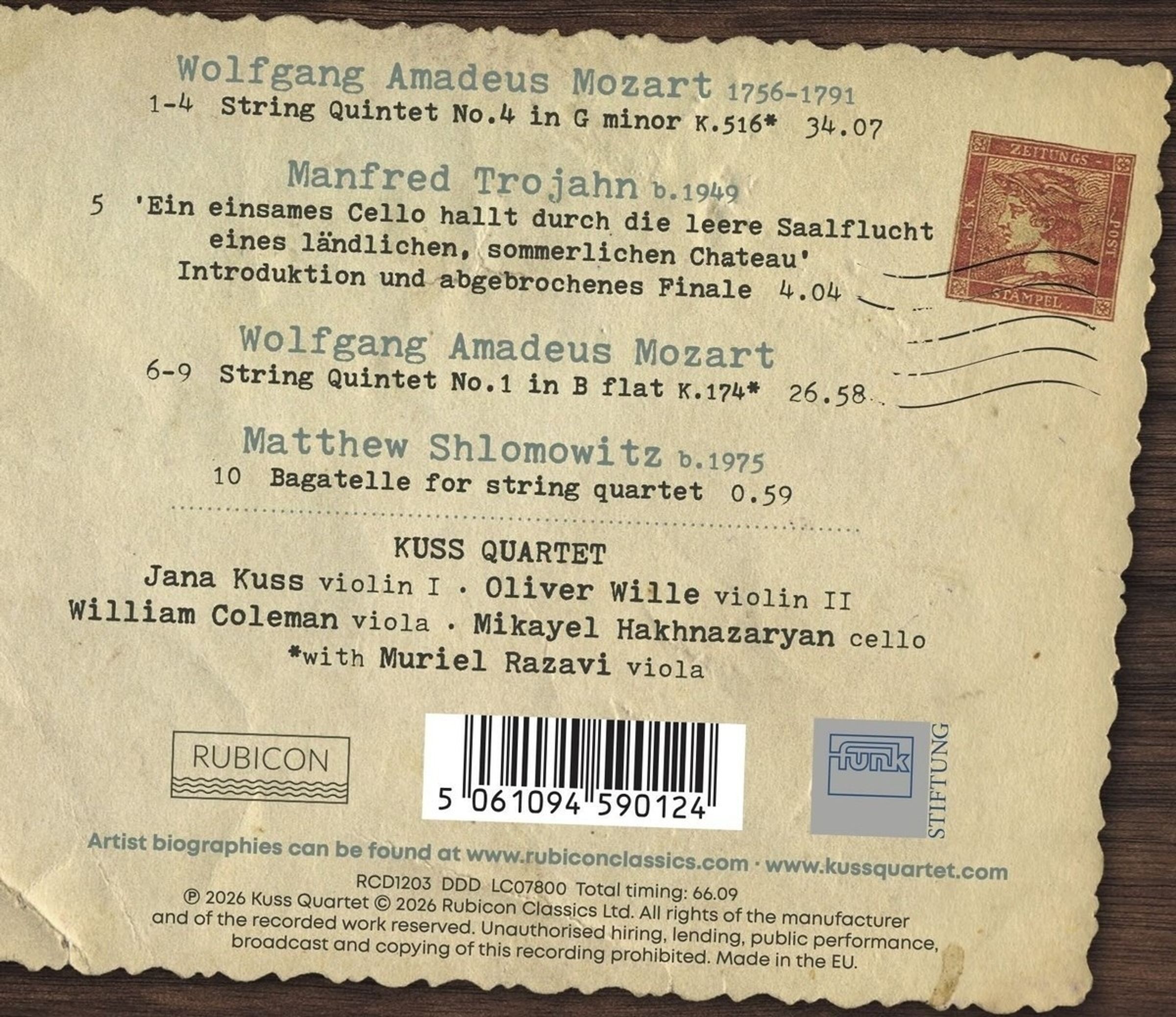 Das Kuss Quartett und die Bratschistin Muriel Razavi beginnen einen dreiteiligen Zyklus mit den sechs Streichquintetten von Mozart. Das erste dieser Werke stammt aus dem Jahr 1777 und orientiert sich eng an den zeitgenössischen Quintetten von Michael Haydn. Das g-moll-Quintett, das vierte der Reihe, wurde 1786 komponiert. Es ist düster, turbulent und melancholisch – typisch für die g-moll-Werke des Komponisten. Es ist groß angelegt, insbesondere der Eröffnungssatz, einer Gemeinsamkeit mit der Prager Sinfonie und dem zur gleichen Zeit komponierten 25. Klavierkonzert. Eingefügt werden zwei kurze Streichquartette von Manfred Trojahn und Matthew Shlomowitz.
