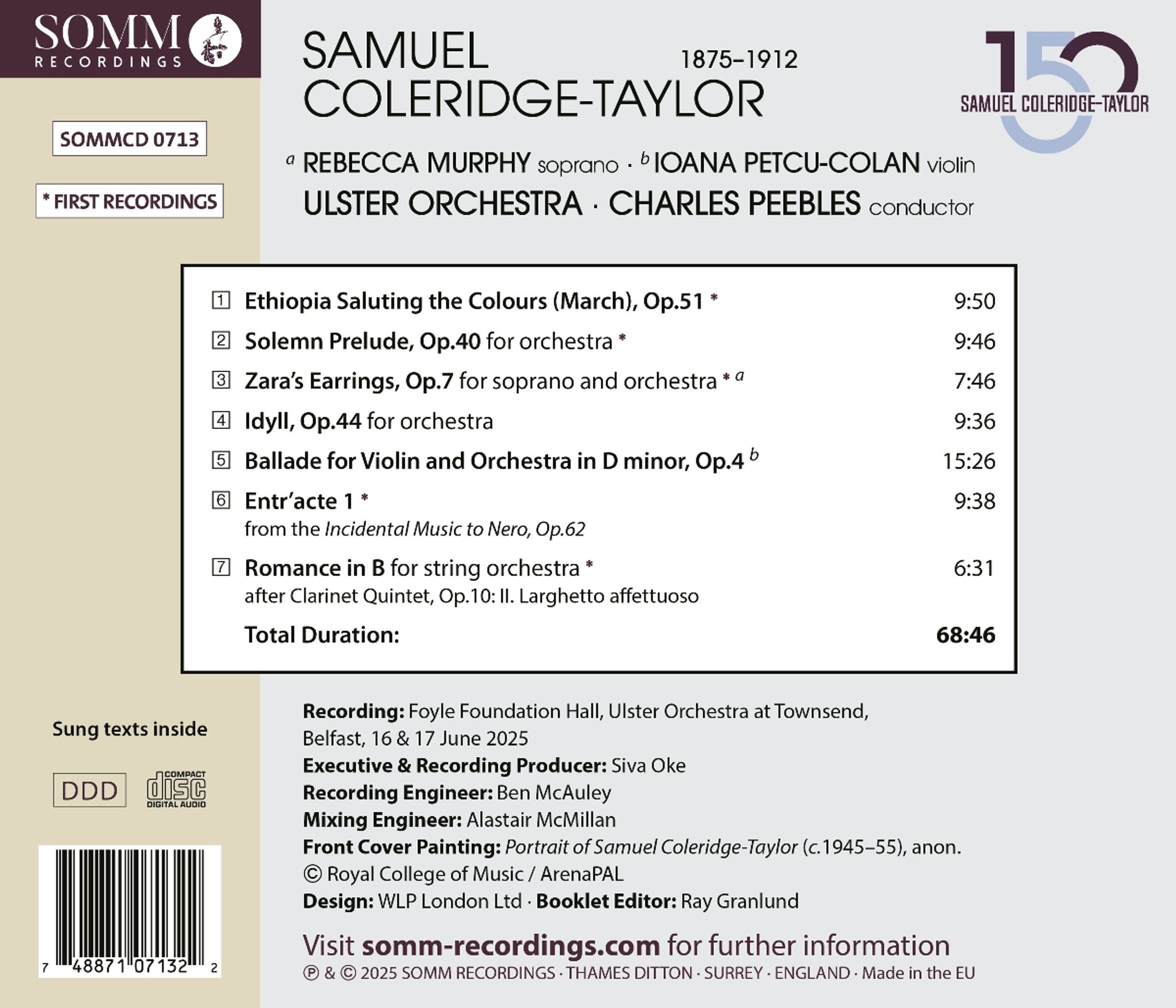Dieses Album feiert den 150. Geburtstag von Samuel Coleridge-Taylor (1875-1912) mit einer vielfältigen Auswahl seiner Orchesterwerke, die sowohl seine afro-britische Herkunft als auch sein musikalisches Umfeld widerspiegeln, zu dem Gustav Holst und Vaughan Williams gehörten. Besonders hervorzuheben ist, dass fünf der sieben hier vorgestellten Werke Erstaufnahmen sind. Es spielt das Ulster Orchestra unter der Leitung von Charles Peebles, dessen Erstaufnahmen der Klavierkonzerte von Dora Bright und Ruth Gipps vielfach gelobt wurden. Es zeigte sich früh, dass Coleridge-Taylor über ein aussergewöhnliches Talent verfügte, und er schuf ein bemerkenswertes Werk, bevor er im Alter von 37 Jahren viel zu früh verstarb. Sein erstes Werk fur Gesang und Orchester, "Zara's Earrings", komponierte er im Alter von nur 19 Jahren, ebenso wie "The Ballade". Als Coleridge-Taylor während seines Studiums am Royal College of Music Johannes Brahms' "Klarinettenquintett" hörte, wurde er dazu angeregt, sein eigenes zu komponieren. "The Romance for string orchestra" ist eine Bearbeitung des introspektiven Larghetto affettuoso-Satzes des Quintetts. "Solemn Prelude", geschrieben für das Worcester Three Choirs Festival von 1899, ein Werk von elegischem Pathos, das seit seiner Wiederaufführung im Jahr 2021 von einigen der renommiertesten Orchestern der Welt gespielt wurde. Coleridge-Taylors "Idyll", ein Auftragswerk für das Gloucester Three Choirs Festival im Jahr 1901, war eine Überarbeitung des "Lament" aus seiner Sinfonie in a-Moll. "Ethiopia Saluting the Colours" aus dem Jahr 1902 ist ein überschwängliches Werk für Orchester und Orgel. Beerbohm Tree beauftragte Coleridge-Taylor 1906 mit der Komposition der Begleitmusik für Stephen Phillips Theaterstuck "Nero", und die Möglichkeit, seine Musik jeden Abend zu hören, war für Coleridge-Taylor eine besondere Freude. Diese Jubiläumssammlung enthält das erste "Entr'acte", das auch bei den Proms 1907 unter Henry Wood zu hören war.