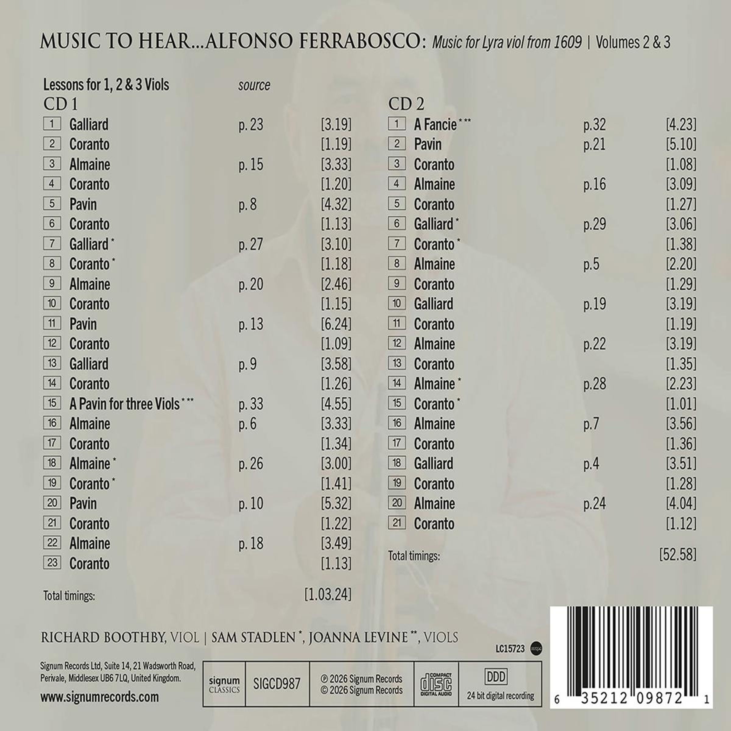 - Richard Boothby (Viola da Gamba), Sam Stadlen (Viola da Gamba), Joanna Levine (Viola da Gamba)