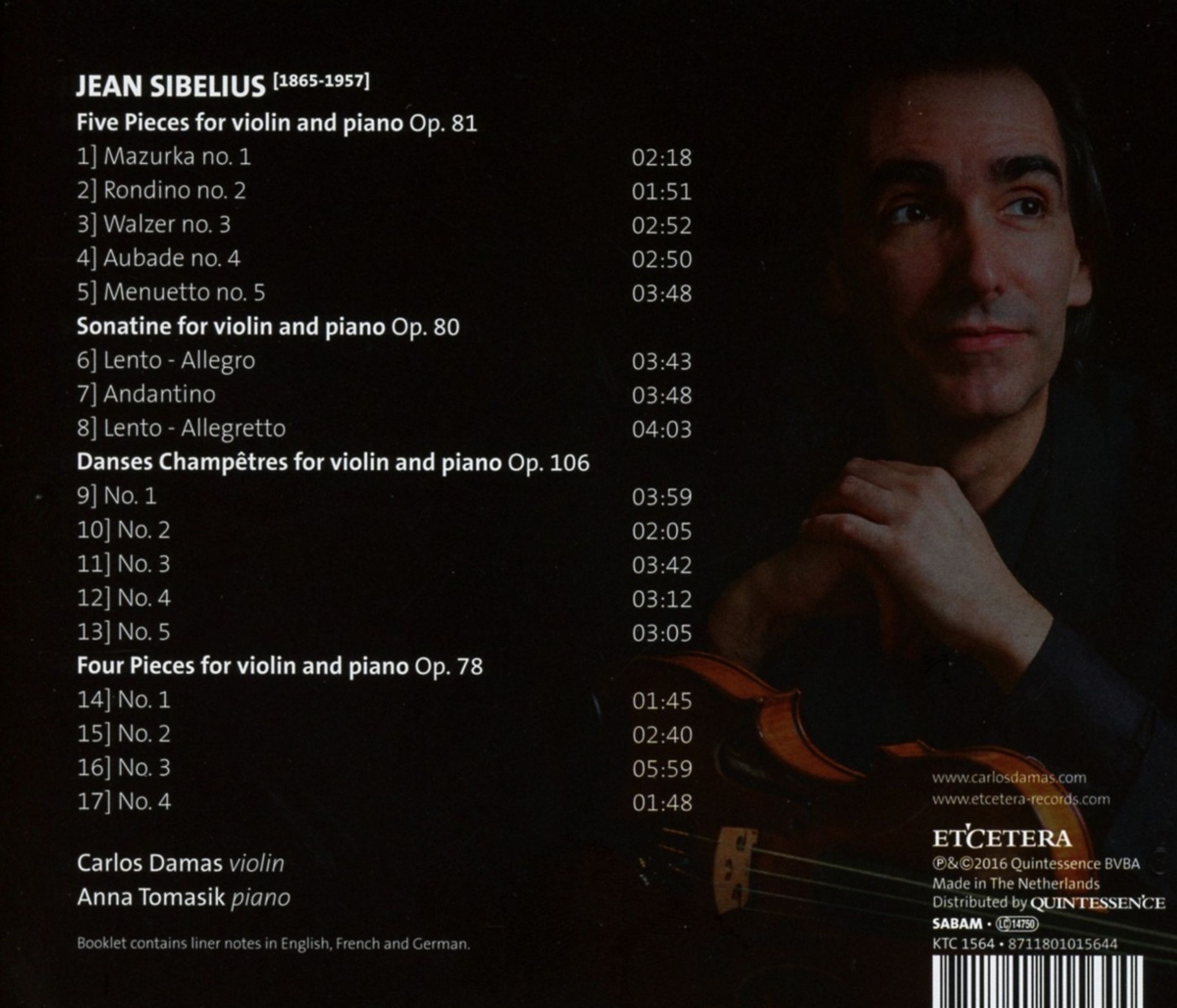 In dieser Aufnahme präsentieren uns Carlos Damas und Anna Tomasik einige kleine Schätze aus der Zeit zwischen 1915 - dem Jahr, in dem Sibelius seine Symphonie Nr. 5 komponierte, die später im Jahr 1919 überarbeitet wurde - und 1924 - dem Jahr seiner Symphonie Nr. 7, seiner letzten und nach Meinung einiger Kritiker seine "bemerkenswerteste kompositorische Leistung". Es sei daran erinnert, dass der 1865 geborene Sibelius den größten Teil seiner Musik in den ersten fünf Jahrzehnten seiner Karriere (1880er bis 1920er Jahre) schrieb und dann seine kompositorischen Talente bis zu seinem Tod 1957 fast vollständig aufgab. Die vorliegende Aufnahme bereichert daher die musikalische Vorstellung, die man sich gewöhnlich von dieser herausragenden Periode macht, auf völlig unerwartete Weise: Anstelle von Sibelius' epischsten und luxuriösesten Sinfonien finden wir einige kleine, malerische, unprätentiöse, unterhaltsame und leicht zugängliche Miniaturen.