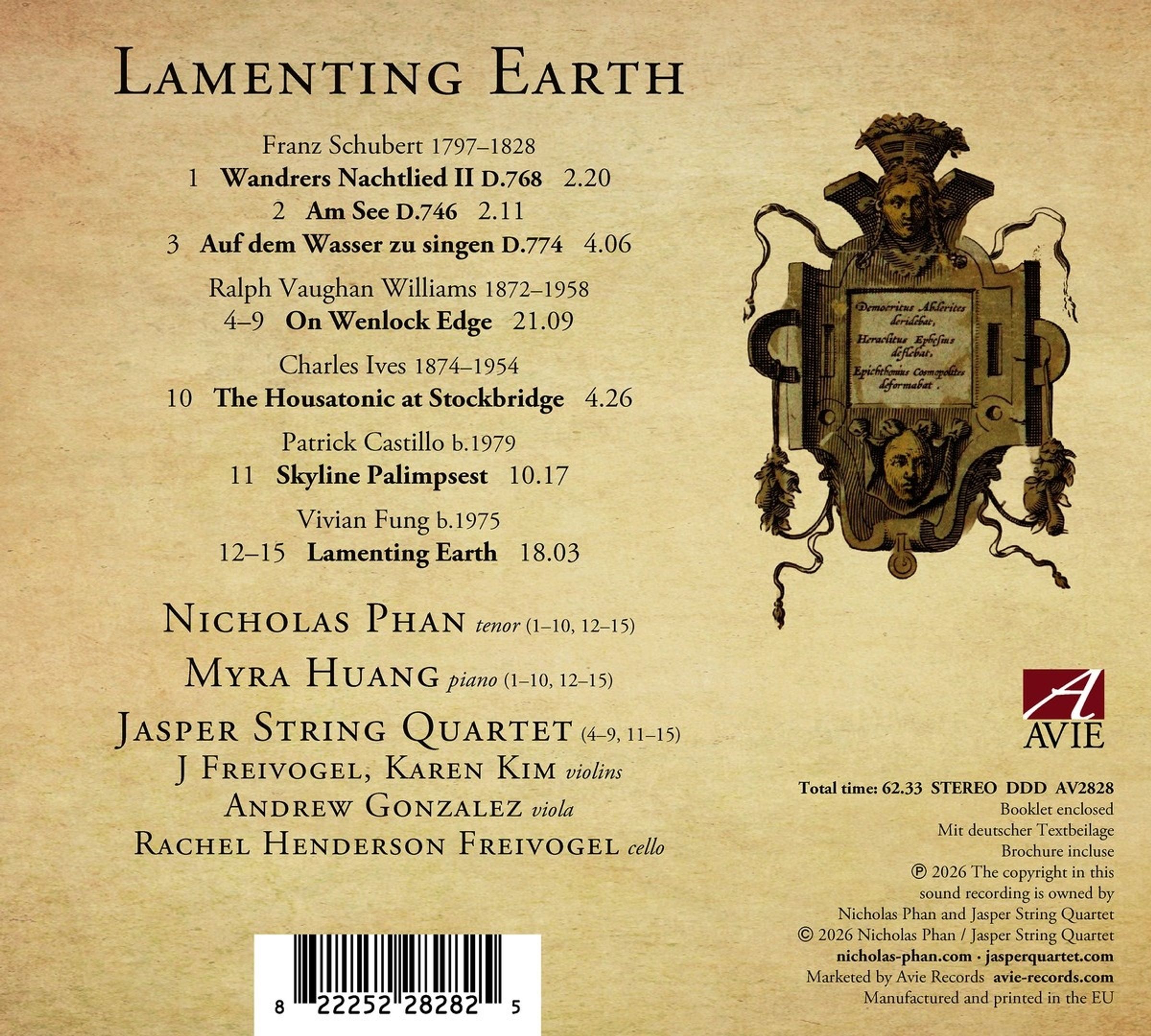 »Lamenting Earth« ist das neueste Album des Grammy-Preisträgers Nicholas Phan mit dem Jasper String Quartet und seiner langjährigen Konzertpartnerin, der Pianistin Myra Huang. Schuberts Lieder beschwören Bilder von Wasser, Stille und Einsamkeit als Spiegel menschlicher Emotionen herauf. Vaughan Williams' »On Wenlock Edge« versetzt den Zuhörer in weite Zeit- und Landschaftszyklen. In Ives' »Housatonic at Stockbridge« verschmelzen Erinnerungen, Hymnen und der Fluss zur schimmernden Meditation. Patrick Castillos »Skyline Palimpsest« ist eine Hommage an New York City. Das Titelstück der Komponistin Vivian Fung ist ein dringender Appell, den Klimawandel zu stoppen.