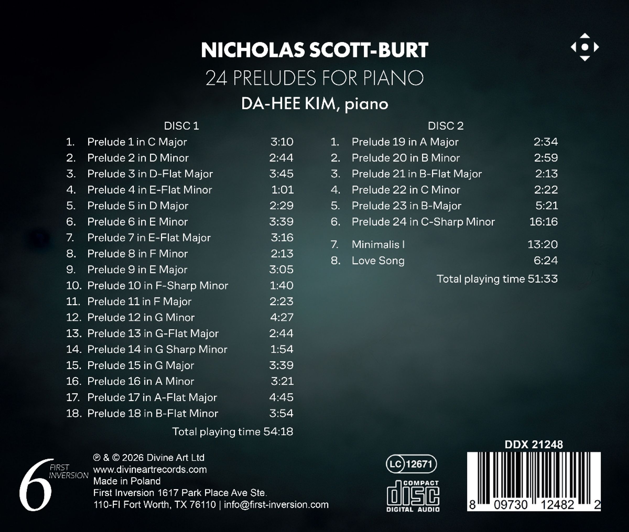 Die preisgekrönte koreanische Pianistin Da-Hee Kim präsentiert die Erstaufnahme von Nicholas Scott-Burts "24 Preludes for Piano". In diesem zwischen 2019 und 2020 komponierten Werk verfolgt der in Bristol geborene Scott-Burt einen postmodernen Ansatz für die langjährige Tradition, einen Zyklus von Werken in allen 24 Dur- und Moll-Tonarten zu präsentieren. In Anlehnung an Komponisten wie Johann Sebastian Bach, Frederic Chopin und Dmitri Schostakowitsch möchte er die jedem Tonart innewohnenden Ausdrucksqualitäten einfangen und gleichzeitig einen einzigartigen architektonischen Ansatz in das Werk einbringen. Jedes Präludium wird als Miniatur behandelt, verbindet sich aber auch mit den anderen zu einer nahtlosen, integrierten Struktur - einer riesigen "Sinfonie" für das Klavier. Da-Hee Kim wurde am Pariser Konservatorium ausgebildet und studierte anschließend an der Hochschule für Musik und Theater in München. Sie schloss ihr Studium am Peabody Conservatory in den USA mit einem Doktor der Musikwissenschaften in der Fachrichtung Klavier ab.