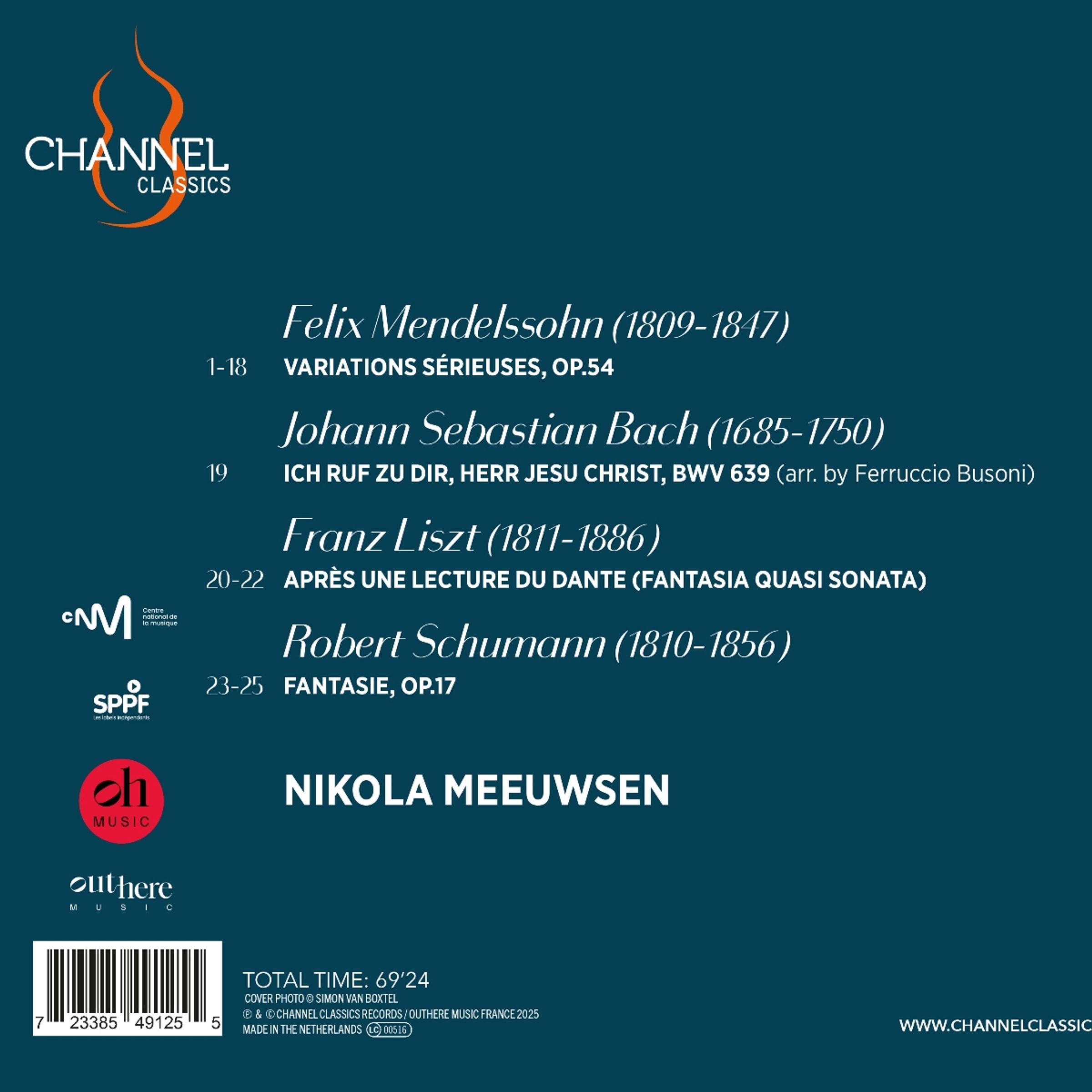 Auf seinem Debütalbum spielt Nikola Meeuwsen drei Meisterwerke aus den Anfangsjahren der Romantik, einem goldenen Zeitalter der Musik, in dem sich die Komponisten für vielfältige Inspirationsquellen öffneten und nach den Sternen griffen. Felix Mendelssohn trat für seine Variations Sérieuses, ein virtuoses Stück, in dem das Thema raffinierte Verwandlungen erfährt, in einen Dialog mit seinem Vorgänger Beethoven. Robert Schumann trat mit seiner Fantasie, einem Denkmal für seine Liebe zu Clara, in einen Dialog mit dem Innersten seiner Seele. Franz Liszt trat in seiner Dante-Sonate in einen Dialog mit der Weltliteratur. Mit orchestralen Klangfarben malte er den Abstieg in Dantes Hölle, einen titanischen Kampf zwischen Gut und Böse, der dem Pianisten das Äußerste abverlangt. Als Vorspiel spielt Nikola Bachs Choralvorspiel Ich ruf' zu dir, Herr Jesu Christ in der Klavierbearbeitung von Ferruccio Busoni. Ein phantasievolles Programm, eine Komposition für sich.