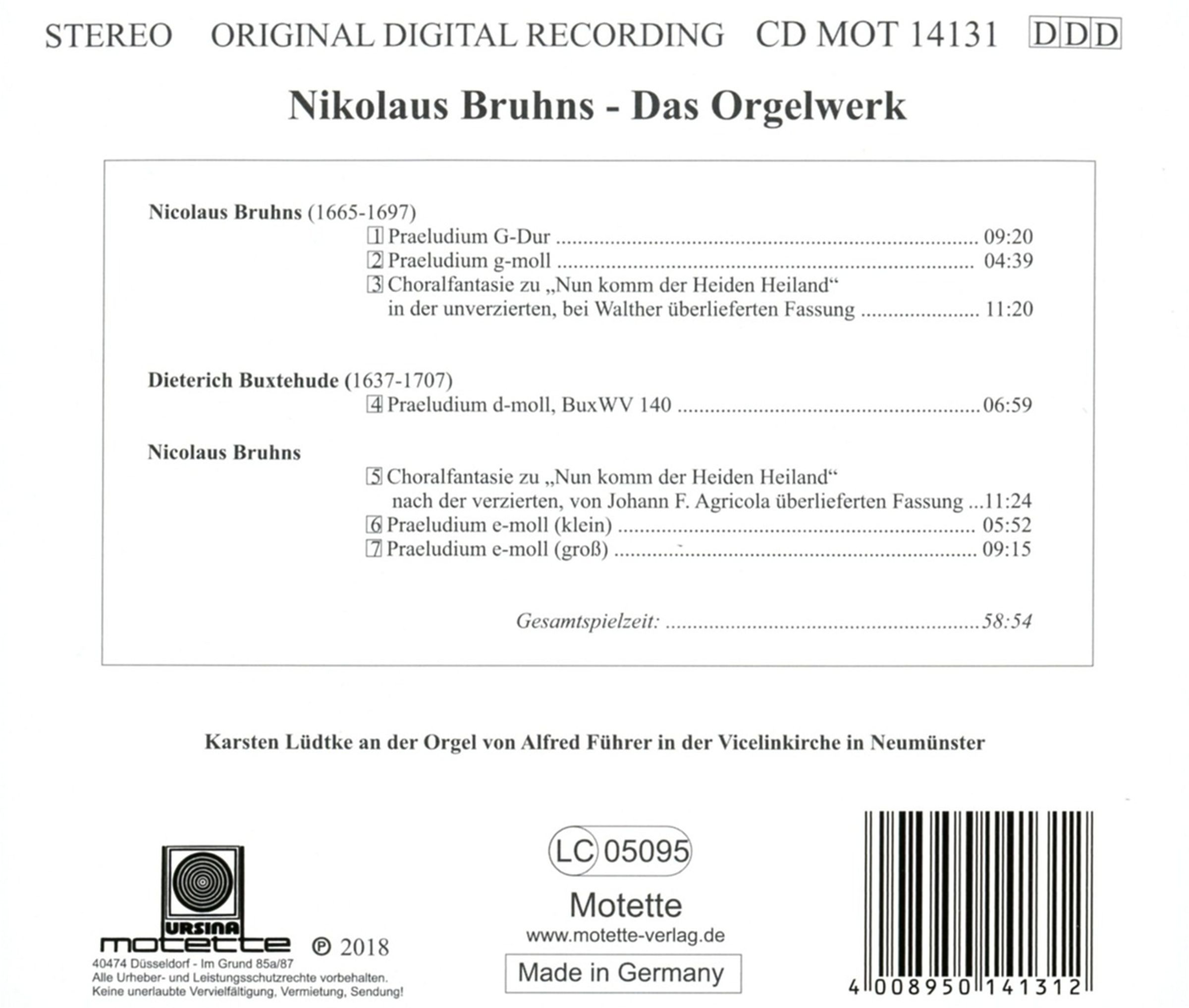 Präludien e-moll (klein), e-moll (groß), G-Dur & g-moll; Choralfantasie "Nun komm der Heiden Heiland" in der unverzierten, bei Walther überlieferten Fassung; Choralfantasie "Nun komm der Heiden Heiland nach der verziereten, von Johann F. Agricola überlieferten Fassung