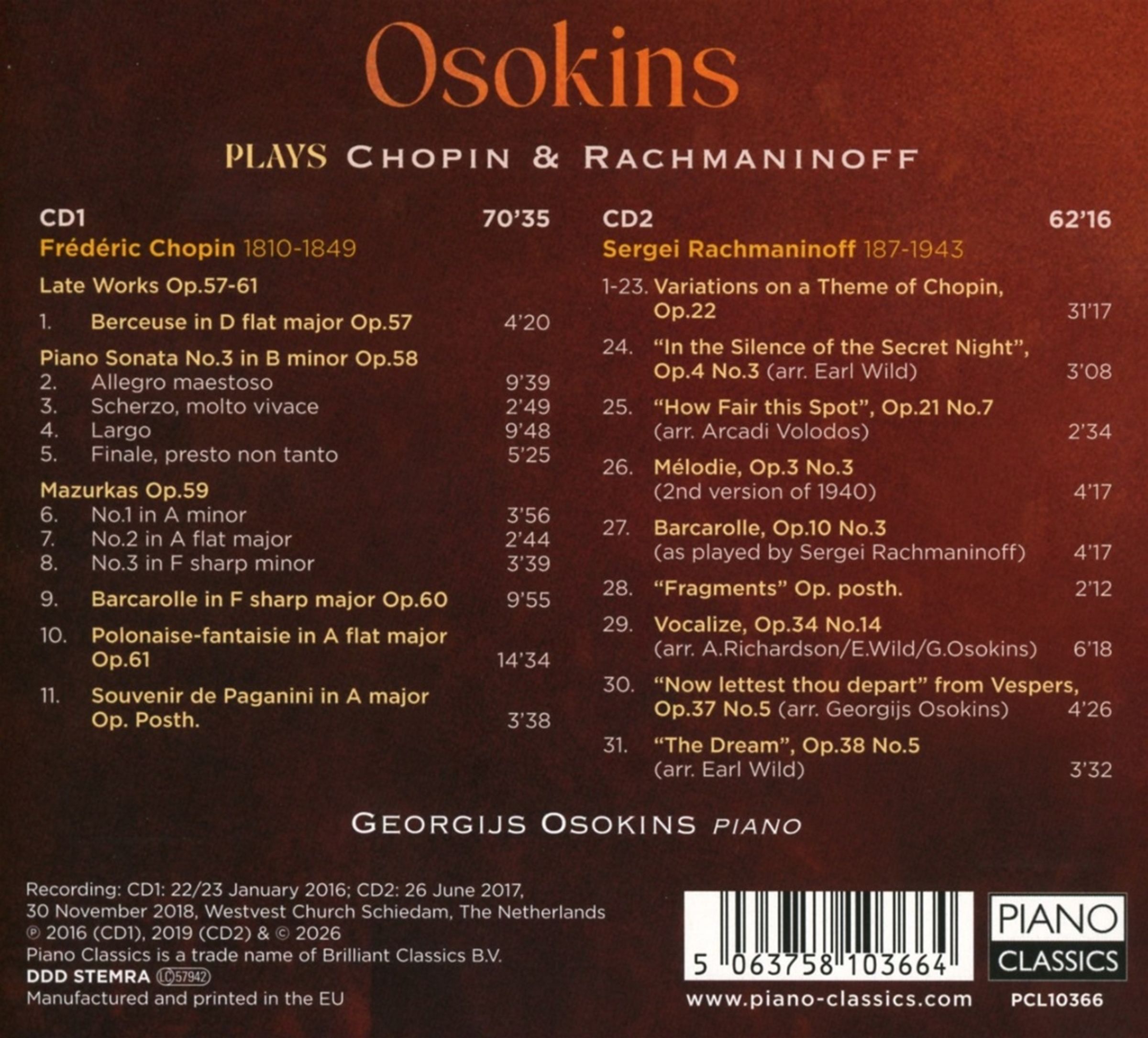 Eine aufschlussreiche Gegenüberstellung der beiden Giganten des Klavierspiels, die das romantische Zeitalter einrahmen, von einem Pianisten mit wachsendem internationalem Ruf. Der lettische Pianist Georgijs Osokins nahm die Werke zwischen 2016 und 2018 für Piano Classics auf, und sie stießen bei ihrer ersten Veröffentlichung auf begeisterte Resonanz bei den Kritikern. In Gramophone lobte Jeremy Nicholas die „kraftvolle und klar artikulierte Interpretation” von Rachmaninows Variationen über ein Thema von Chopin, während die beiden Transkriptionen „ein weiterer Beweis für Osokins' stilistische Identifikation mit Rachmaninows Idiom” seien. Das Chopin-Album entstand kurz nachdem Osokins sich bei dem Chopin-Wettbewerb 2015 in Warschau unter den Medaillengewinnern platziert hatte, wo er mit seinen Interpretationen, die viele als radikal empfanden, die Meinungen spaltete. Die Kohärenz seines Denkens zeigt sich jedoch deutlich in der Abfolge, die das „späte” Denken und Klavierspiel Chopins nachzeichnet, da sie sich in poetische Gefilde vorwagt, die selbst von ihm bisher unerforscht waren, von der dritten Klaviersonate bis hin zur visionären Polonaise-Fantaisie. Es handelt sich um Werke, die die abenteuerlustigsten Köpfe und Musiker jeder Generation immer wieder herausfordern und belohnen werden, und mit diesem Album hat sich Osokins in ihre Reihen eingereiht.