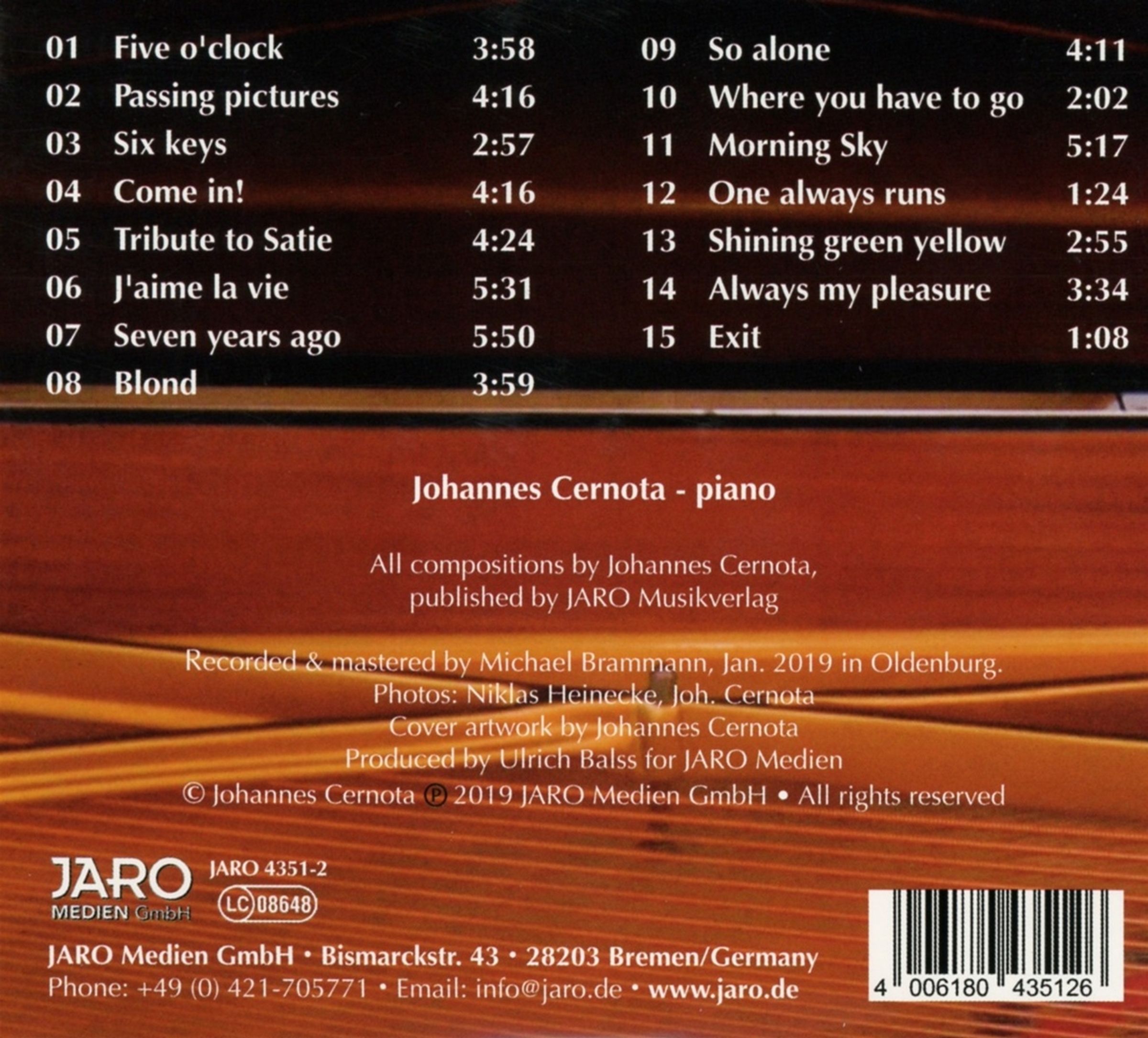 Johannes Cernota veröffentlichte bisher drei CDs bei JARO. Oh!That Cello mit dem Ceilisten Thomas Beckmann, der Musik Charlie Chaplins gewidmet war eine Welterfolgmit mehreren 100.000 verkauften Cds und Lps. Die CD Einspielung Erik Satie von Johannes Cernota gilt als eine der besten Satie Einspielungen überhaupt. Sport & Vergnügen CD und Buch zusammen war binnen eines Jahres ausverkauft und nur in einer limitierten Auflagen erhältlich. Cernota ist auch als Bildener Künstler unterwegs und hat nun nach vielen Bitten eine neue CD eingespielt, sozusagen eine Hommage an Erik Satie nur mit Eigenkompositionen.