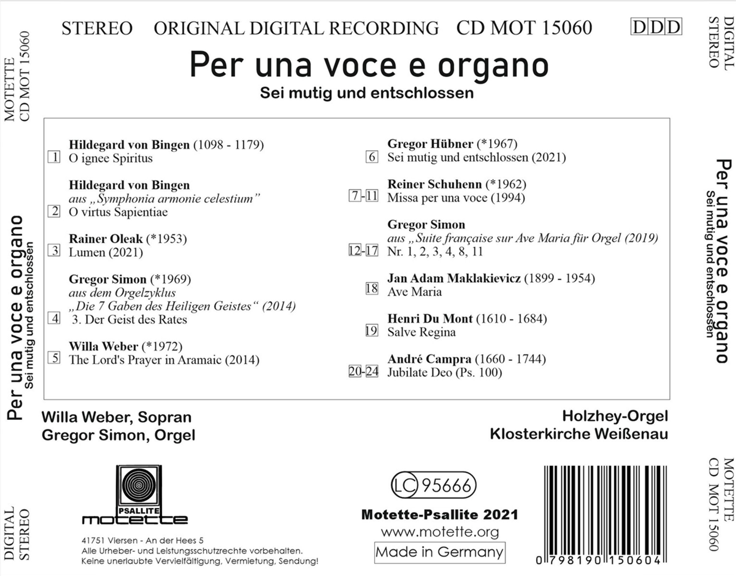 Willa Weber & Gregor Simon - Per una voce e organo auf CD