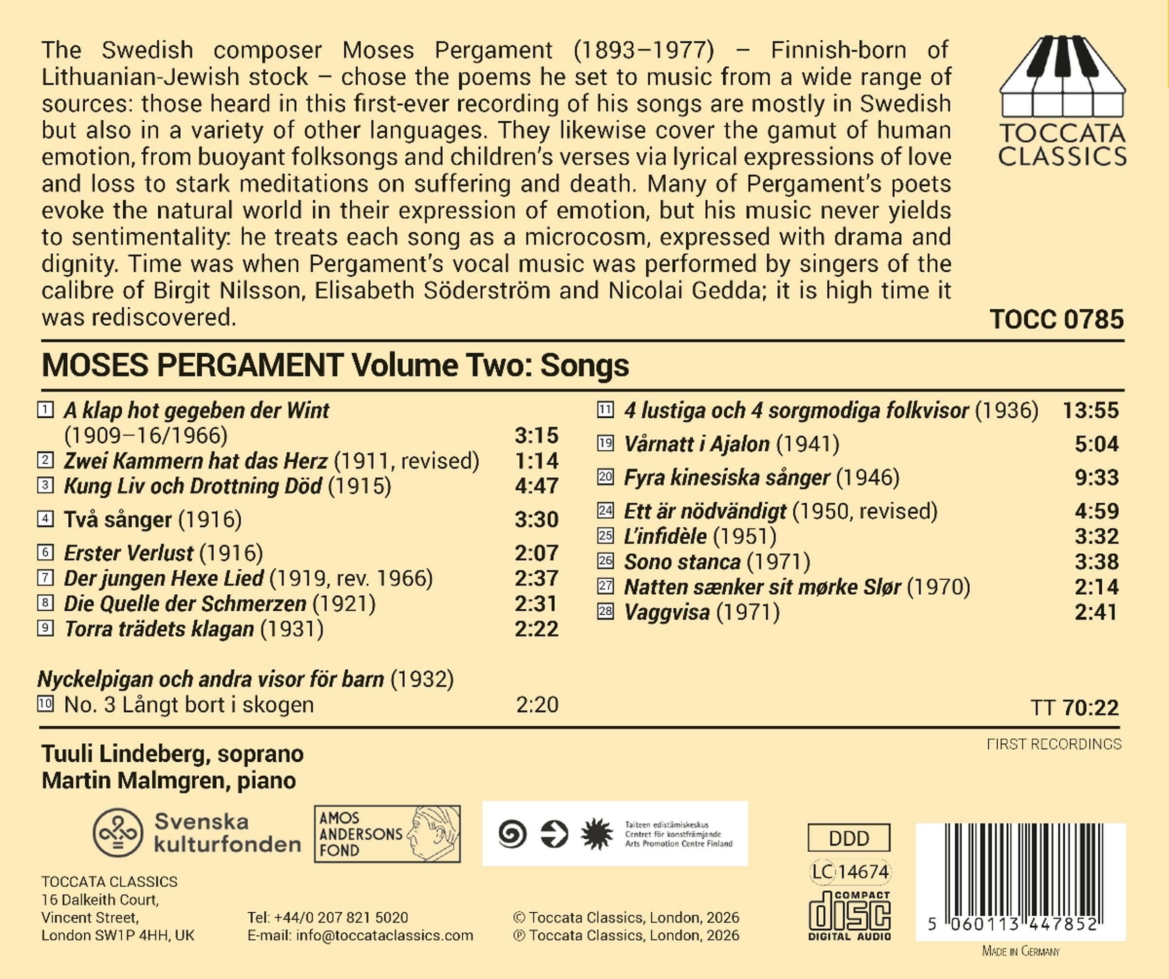 Zum ersten Mal wurden Lieder des schwedischen Komponisten Moses Pergament (1893-1977) - finnischer Herkunft mit litauisch-jüdischen Wurzeln - aufgenommen. Er wählte die Gedichte, die er vertonte, aus einer Vielzahl von Quellen aus: Die auf diesem Album vertretenen Gedichte sind überwiegend in schwedischer Sprache, aber auch in einer Vielzahl anderer Sprachen verfasst. Sie decken ebenfalls die gesamte Bandbreite menschlicher Emotionen ab, von beschwingten Volksliedern und Kinderreimen über lyrische Ausdrucksformen von Liebe und Verlust bis hin zu ernsten Betrachtungen über Leiden und Tod. Viele von Pergament ausgewählte Dichter beschwören in ihrem Ausdruck von Emotionen die Natur herauf, aber seine Musik gibt sich niemals der Sentimentalität hin: Er behandelt jedes Lied wie einen Mikrokosmos, der mit Dramatik und Würde zum Ausdruck gebracht wird. Es gab eine Zeit, in der Pergaments Vokalmusik von Sängern des Kalibers von Birgit Nilsson, Elisabeth Söderström und Nicolai Gedda aufgeführt wurde; es ist höchste Zeit, dass sie wiederentdeckt wird. Hier sind die Sopranistin Tuuli Lindberg und der Pianist Martin Malmgren zu hören.