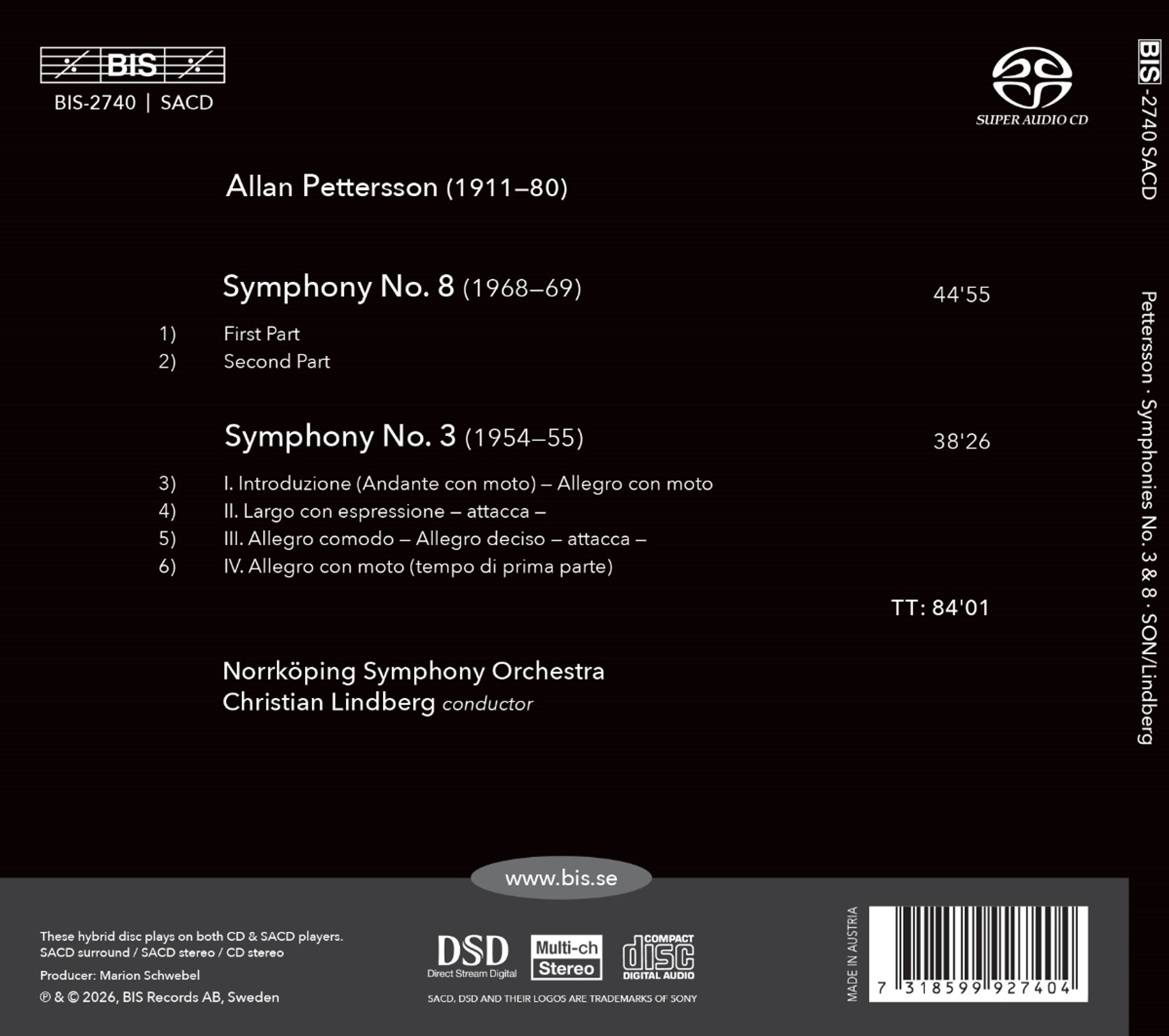 Seit 2010 verfolgen Christian Lindberg und das Norrköping Symphony Orchestra ein einzigartiges und ehrgeiziges Projekt: die vollständige Aufführung und Aufnahme aller Orchesterwerke von Allan Pettersson, dem schwedischen Meister der Sinfonik, der für seine zutiefst persönlichen und emotional aufgeladenen Kompositionen bekannt ist. Die 1956 uraufgeführte Sinfonie Nr. 3 ist innerhalb von Petterssons umfangreichem sinfonischem Schaffen einzigartig, da sie seine einzige Sinfonie in vier Sätzen ist und einer eher traditionellen Struktur folgt. Obwohl es sich um ein Frühwerk handelt, das Einflüsse von Dmitri Schostakowitsch, Jean Sibelius und Gustav Mahler widerspiegelt, ist es keineswegs ein unbedeutendes Werk. Auch wenn die lyrischen Passagen, die später seinen Stil prägen sollten, noch nicht voll entwickelt sind, bietet die Sinfonie eine prägnante und scharf gezeichnete musikalische Landschaft, die sowohl beeindruckend als auch auffallend originell ist. Die 1972 uraufgeführte Sinfonie Nr. 8 ist wohl Petterssons beühmteste und am häufigsten aufgeführte Sinfonie. Ihre ausgedehnten, oft als 'frei' oder 'unendlich' beschriebenen Melodien vermitteln den Eindruck einer grenzenlosen Fortsetzung, doch das Werk ist alles andere als ruhig. Wie fur Pettersson charakteristisch, besitzt die Sinfonie einen starken autobiografischen Charakter. Mit seinen eigenen Worten: 'Das Werk, an dem ich arbeite, ist mein eigenes Leben, das gesegnete und das verfluchte: Ich widme mich ihm, um das Lied wiederzuentdecken, das die Seele einst sang.'
