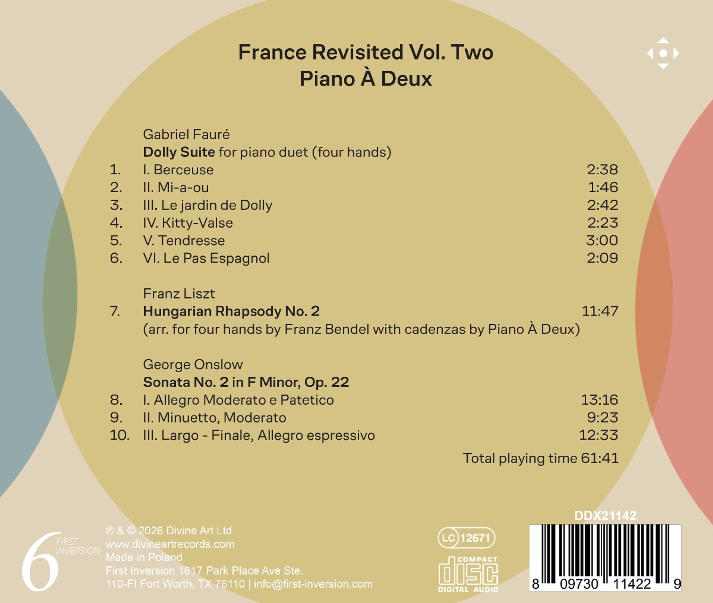 Das Klavier-Duo Piano A Deux, bestehend aus Robert and Linda Stoodley, meldet sich mit Teil 2 der Reihe "France Revisited" zurück. Die "Dolly-Suite" von Gabriel Faure besteht aus sechs Duetten zu vier Händen und wurde für die Tochter von Emma Bardac geschrieben, die später Claude Debussy heiratete. Der in Frankreich geborene, aber englischstämmige George Onslow fand mit seiner Musik bei Koryphäen wie Robert Schumann und Felix Mendelssohn Anklang und wurde von seinem Verleger und anderen Zeitgenossen zum "französischen Beethoven" gekürt, fiel aber später in Ungnade. Bei ihren Recherchen über weniger bekannte Komponisten entdeckte Piano A Deux in einer verstaubten Bibliotheksschublade die Duosonaten von Onslow. Die Duo-Sonate Opus 7 wurde für den ersten Teil von France Revisited" aufgenommen, und die Sonate Nr. 2 in f-Moll, Opus 22, ist in diesem zweiten Band zu hören. Sie wurde von Frederic Chopin und Franz Liszt mehrfach aufgeführt, ist in großem Stil konzipiert, sinfonisch aufgebaut und spiegelt die Beethovenschen Aspekte von Onslows Stil wider. Liszts "Ungarische Rhapsodie" Nr. 2 ist wahrscheinlich eines der bekanntesten Solostücke des Klavierrepertoires, von einem Komponisten, der weltweit immer noch verehrt wird. Piano A Deux haben Franz Bendels Bearbeitung für vier Hande genommen, sie angepasst und ihre eigenen Kadenzen geschrieben, und so dem Stück eine neue persönliche Note gegeben. Als abenteuerlustiges Klavierduo mit einem breit gefächerten Repertoire, das sowohl große klassische Werke als auch eigene Bearbeitungen aus der Welt der Oper, des Films und des Musiktheaters umfasst, sind Piano A Deux bereits in vielen Ländern aufgetreten und sind gefeiert worden. Mit ihren Konzerten auf Kreuzfahrtschiffen haben sie sich inzwischen eine große Fangemeinde aus erfahrenen Konzertbesuchern und neuen Zuhörern erspielt, die von ihren einzigartigen Themenprogrammen, ihrem exquisiten Musizieren und ihrem mit Humor gepaarten Charisma begeistert sind.