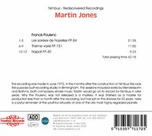 Diese Aufnahme entstand im Juni 1972, wenige Monate nach der Fertigstellung des ersten eigens für diesen Zweck gebauten Aufnahmestudios von Nimbus Records in Birmingham. Die Sessions umfassten Werke von Felix Mendelssohn und Johannes Brahms, zwei Komponisten, deren Musik Martin in späteren Jahren für Nimbus aufnehmen sollte. Warum das Werk von Francis Poulenc nicht veröffentlicht wurde, ist ein Rätsel. Es wurde weniger als einen Monat nach der Aufnahme als Master für die Produktion fertiggestellt, lag aber 53 Jahre lang ungenutzt in den Regalen. Martin Jones Martin Jones ist seit seinem internationalen Durchbruch im Jahr 1968, als er den Dame-Myra-Hess-Award erhielt, einer der angesehensten Solopianisten Großbritanniens. Im selben Jahr gab er sein Debüt in London in der Queen Elizabeth Hall und in New York in der Carnegie Hall und ist seitdem auf beiden Seiten des Atlantiks für Recitals und Konzertauftritte gefragt. Er ist ein produktiver Aufnahmekünstler und zu seinen zahlreichen großen Projekten gehören die gesamten Soloklavierwerke von Felix Mendelssohn, Johannes Brahms, Claude Debussy, Percy Grainger, Igor Strawinsky, Erich Wolfgang Korngold, Karol Szymanowski, Enrique Granados, Carlos Guastavino, Federico Mompou, Ernesto Halffter Escriche, Joaquin Nin, Has Gál, Jean Françaix, Jean Roger-Ducasse und Alan Richardson.