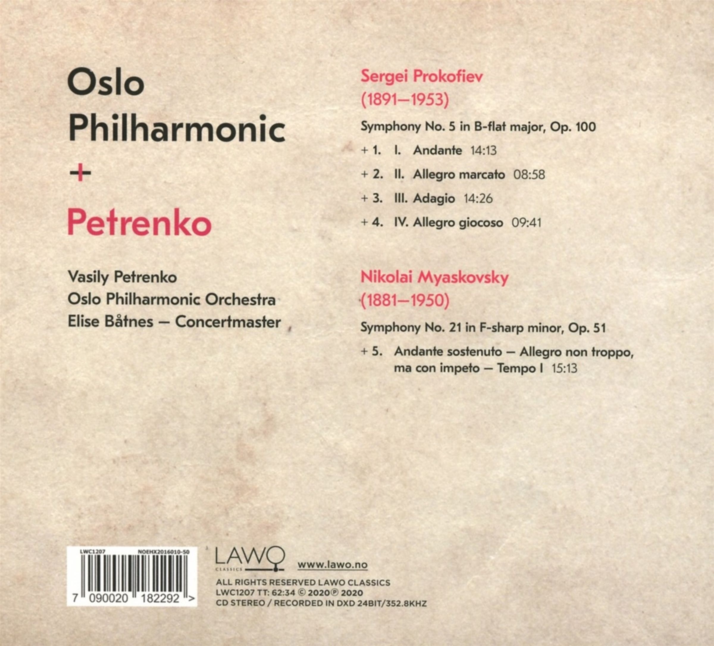 Nachdem die Osloer Philharmoniker und ihr ehemaliger Chefdirigent Vasily Petrenko ihren vielfach geschätzten Zyklus der Orchesterwerke von Alexander Scriabin und Richard Strauss abgeschlossen haben, präsentieren sie die erste von zwei Veröffentlichungen symphonischer Werke von Prokofjew und Myaskowski. Sergei Prokofjew kann als einer der wichtigsten Symphoniker seiner Zeit angesehen werden. Er beschrieb seine Sinfonie Nr. 5, seine erste Komposition in diesem Genre seit 16 Jahren, als „… den Höhepunkt einer ganzen Periode in meinem Werk. Ich habe es als eine Symphonie über die Größe des menschlichen Geistes konzipiert. “ Er betrachtete diese im Sommer 1944 komponierte Symphonie als sein schönstes Werk.