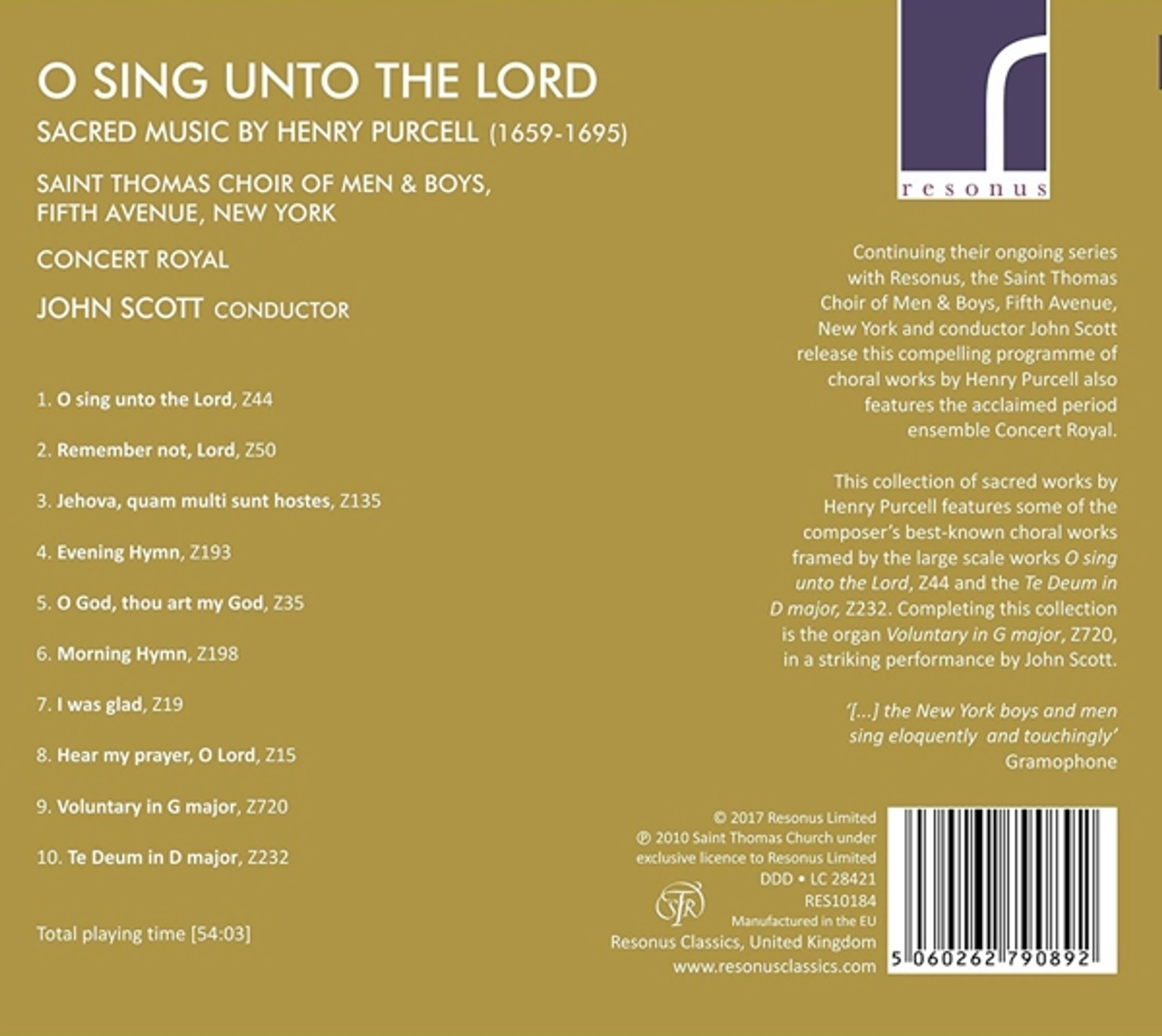 O sing unto the Lord; Remember not, Lord; Jehova, quam multi sunt hostes mei; Evening Hymn; O God, thou art my God; Morning Hymn; I was glad; Hear my prayer, O Lord; Voluntary G-Dur; Te Deum D-Dur