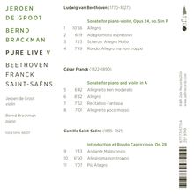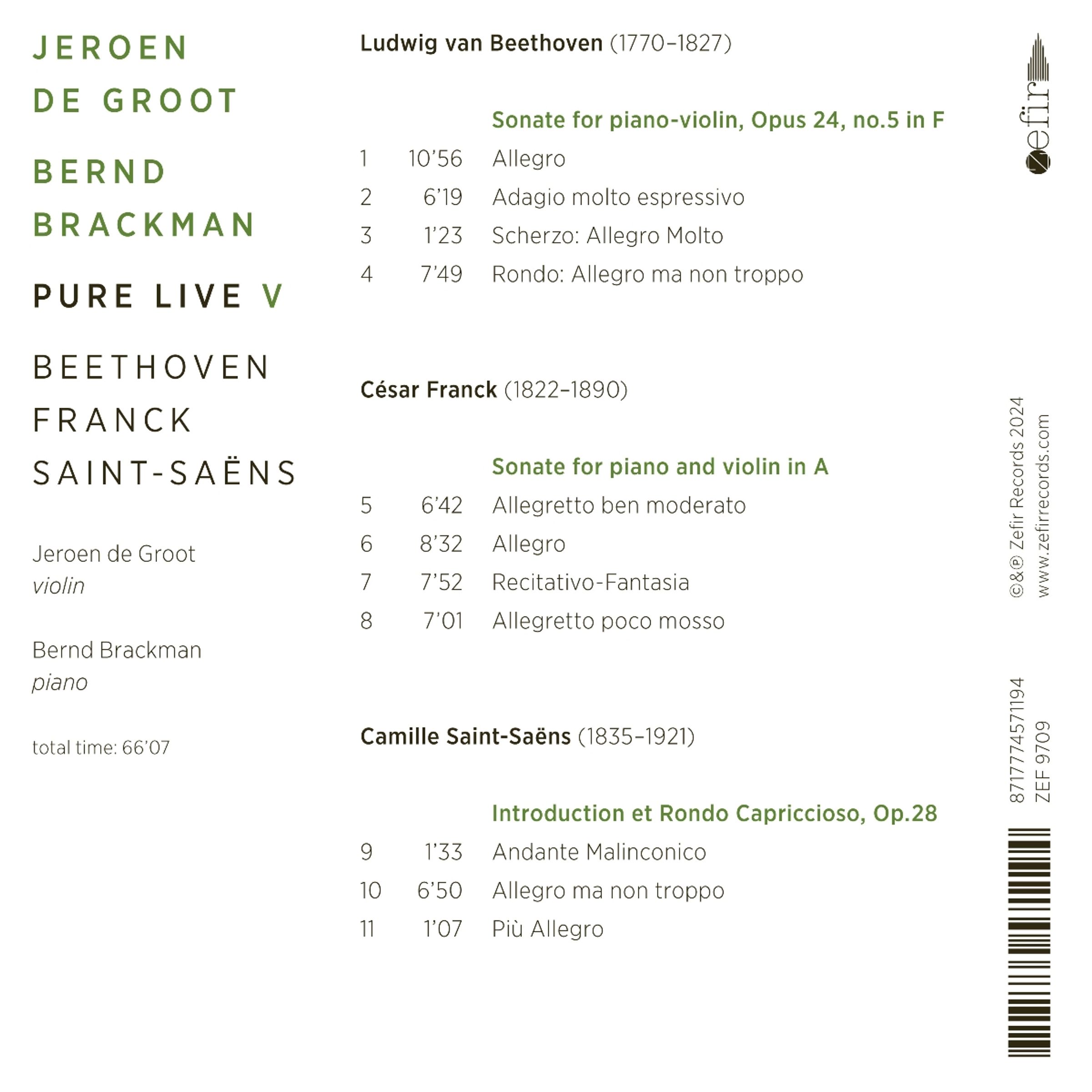 Pure Live V ist ein Mitschnitt eines Konzerts, das im November 2024 im Zeeuwse Concertzaal in Middelburg stattfand. Der Geiger Jeroen de Groot und der Pianist Bernd Brackman spielten Beethovens Frühlingssonate, Francks Violinsonate und Saint-Saéns' „Introduction et Rondo Capriccioso“. Der Geiger Jeroen de Groot studierte bei den drei begabten Geigenpädagogen Herman Krebbers, Sandor Vegh und Ivry Gitlis. Er hat viele nationale und internationale Preise bei verschiedenen Wettbewerben gewonnen. Jeroen verbindet mit seiner Art des Geigenspiels regelmäßig Schlüsselbegriffe wie Überraschung, Spontaneität, Wärme und Kommunikation. Der Pianist Bernd Brackman erhielt seinen ersten Klavierunterricht von seiner Mutter Frieda Brackman-Hoogerwerf. Er studierte bei Jaap Spaanderman und Jan Wijn am Sweelinck-Konservatorium in Amsterdam. Außerdem besuchte er Meisterkurse bei Pianisten wie Vlado Perlemutter, Naum Grubert und Leon Fleischer. Beide Musiker gehen auf die Musik ein und nehmen daher auch kleine Unvollkommenheiten in Kauf. Ein Aufnahmestudio, in dem jede Unvollkommenheit korrigiert wird, ist für sie seelenlos, wird den Qualitäten der Musiker oft nicht gerecht und bietet den Interpreten zu wenig Möglichkeiten, ihre eigene Interpretation der Musik zu geben. Die Musik, die auf dieser CD zu hören ist, darf zu Recht den Titel „Pure Live“ tragen. Sicherlich schöpft sie aus den so genannten Klassik-Favoriten, aber auf eine andere Art und Weise, als man sie sonst auf Tonträgern hört!