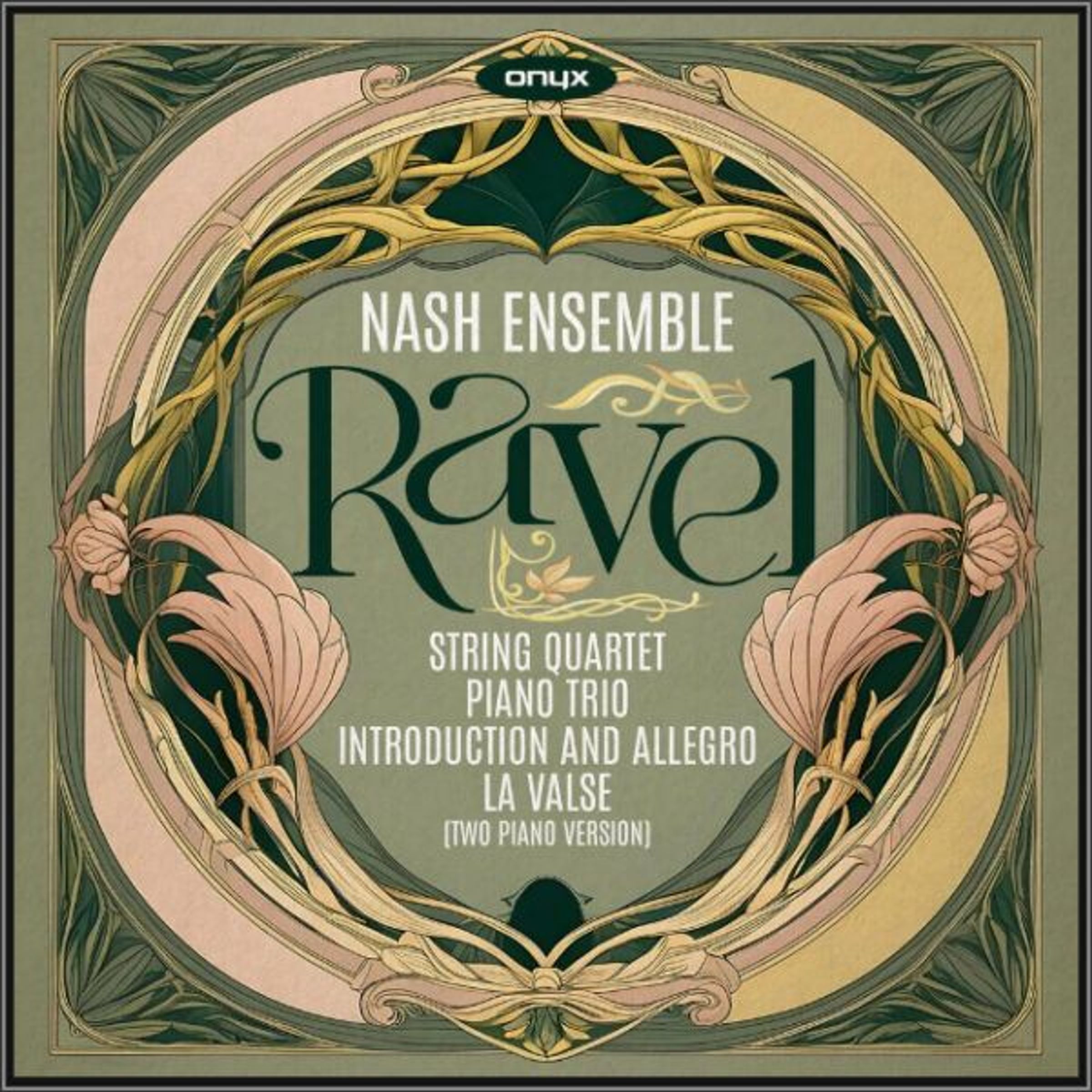 Text: Nash Ensemble, Ravel, String Quartet, Piano Trio, Introduction and Allegro, La Valse (Two Piano Version). Illustration mit floralen Mustern., CD