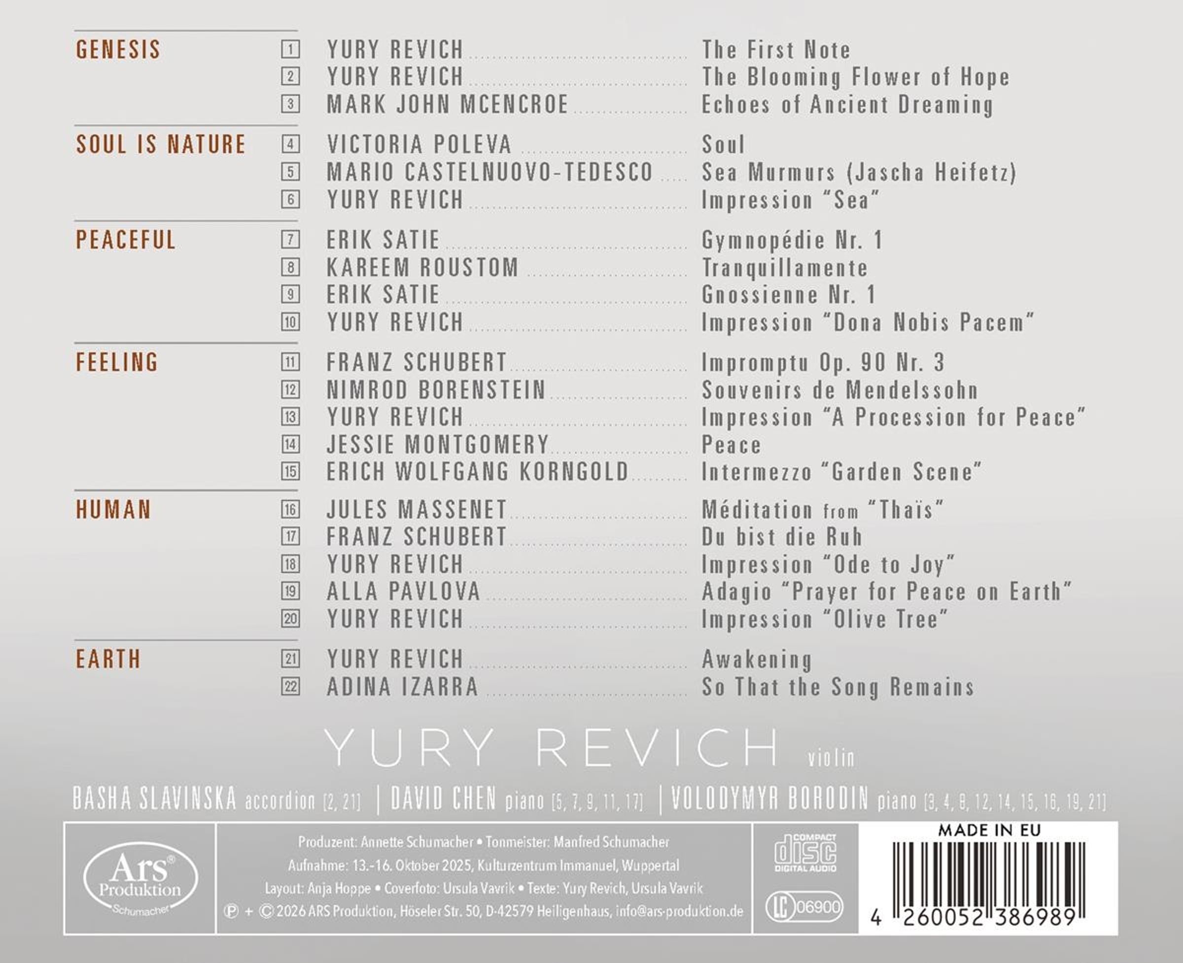 "Yury Revich PEACE", Musiker mit Geige, weiße Kleidung mit Rüschen, ruhig und konzentriert., CD