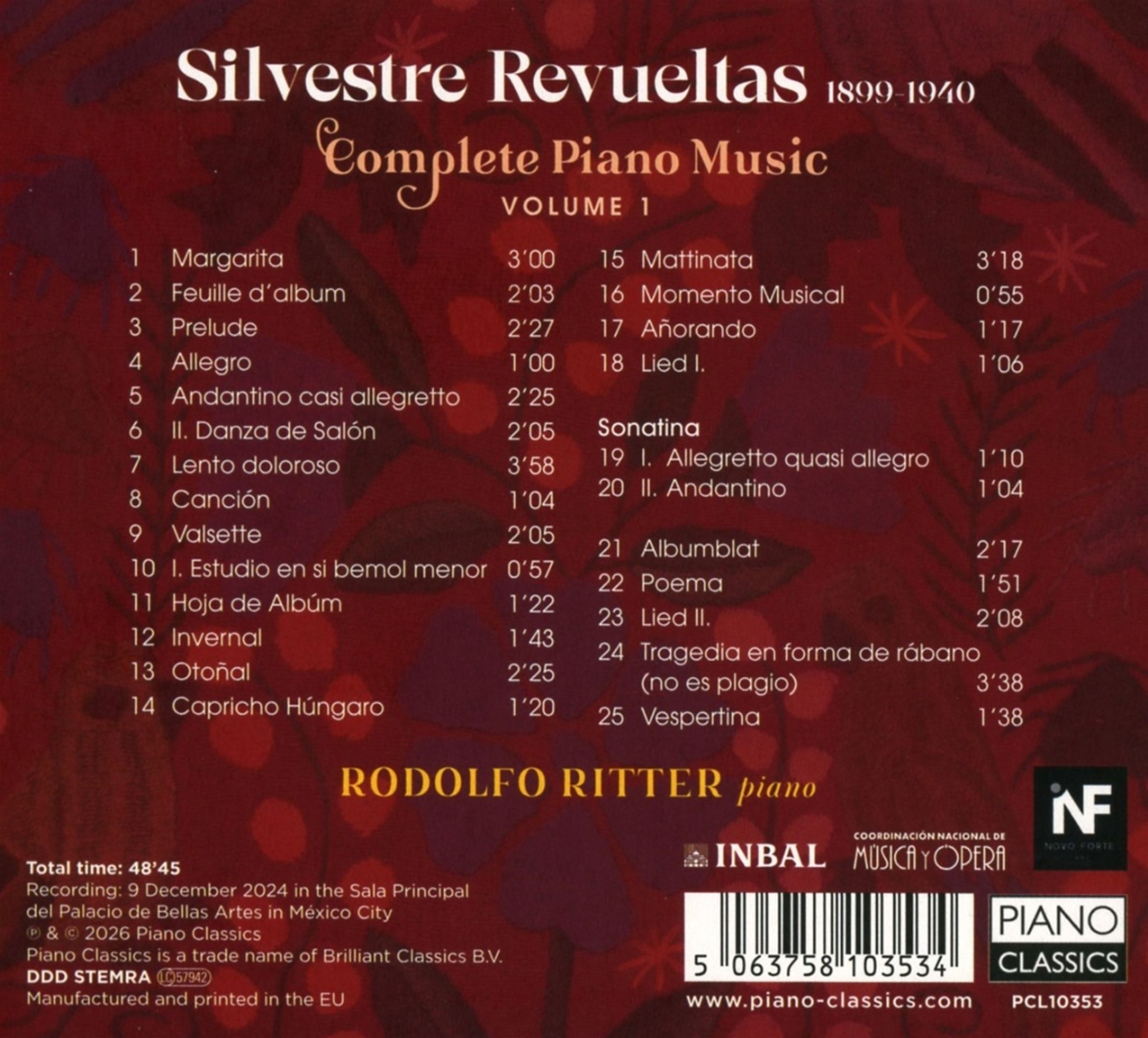 Weltpremierenaufnahmen früher Werke, die neues Licht auf eine grundlegende Figur der klassischen Musik in Mexiko werfen. Bislang ging man allgemein davon aus, dass Silvestre Revueltas (1899–1940) erst mit 30 Jahren begann, Musik zu schreiben – in den letzten zehn Jahren seines Lebens, das durch Alkoholismus und Lungenentzündung vorzeitig beendet wurde. Im Alter von 39 Jahren hatte er durch Orchesterwerke wie Sensemaya und La noche de los Mayos verspätet den Status des bedeutendsten mexikanischen Komponisten seiner Generation erlangt; Stücke, die viel weniger europäischen Vorbildern verpflichtet sind als die Werke seiner Vorgänger und Zeitgenossen wie Carlos Chavez. Die Wiederentdeckung dieser Manuskripte im Jahr 2024 zeigt jedoch, dass Revueltas bereits seit seiner Jugend komponierte und dass er sowohl ein versierter Pianist als auch Violinist war. Dieser bahnbrechende Band seiner Klaviermusik enthält 24 einzelne Stücke, von denen keines länger ist als das vierminütige Lento doloroso, und die bis auf eine zweisätzige Sonatine alle einzelne Sätze sind. Die meisten davon stammen aus dem Jahr 1915, während seines Studiums am Nationalkonservatorium, obwohl spätere Werke auch aus Revueltas' späterem Studium in Chicago stammen, während 1919 und dann 1924, als er sein letztes Klavierstück schrieb, eine Satie-ähnliche Caprice mit dem Titel Tragedia en forma de rábano (Tragödie in Form eines Rettichs).