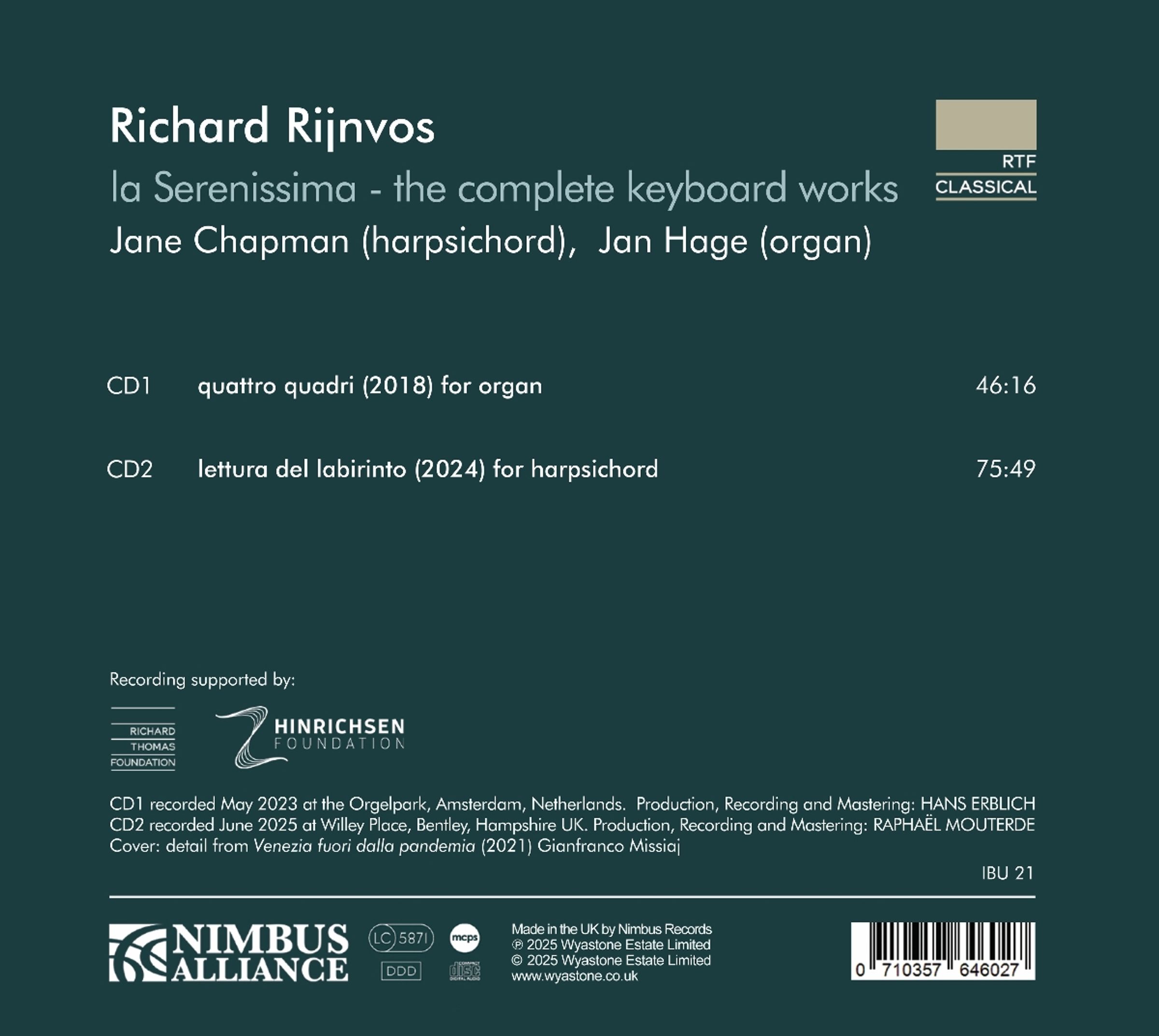 Im Jahr 2001 begann Richard Rijnvos unter dem Titel "la Serenissima" eine Reihe von Kompositionen, die der Stadt Venedig gewidmet sind. Dieses mehrjährige 'Work-in-Progress' umfasst derzeit sieben Kompositionen, von denen die beiden jüngsten Gegenstand dieser Aufnahme sind. Jan Hage ist insbesondere als Verfechter und gefragter Interpret zeitgenössischer Orgelmusik bekannt. Im Jahr 2006 erhielt er fur seine Verdienste um die französische Orgelkultur die Silbermedaille der Pariser Societe Academique Arts Sciences Lettres. Jane Chapman ist eine der renommiertesten klassischen Cembalistinnen Grossbritanniens. Ihr Repertoire reicht von Alter Musik bis zur zeitgenössischen Avantgarde. Von The Independent on Sunday als 'Grossbritanniens progressivste Cembalistin' und vom Guardian als 'furchtlose Interpretin zeitgenössischer Musik' beschrieben, setzt sie sich leidenschaftlich dafür ein, dass neue Musik für das Cembalo komponiert wird.
