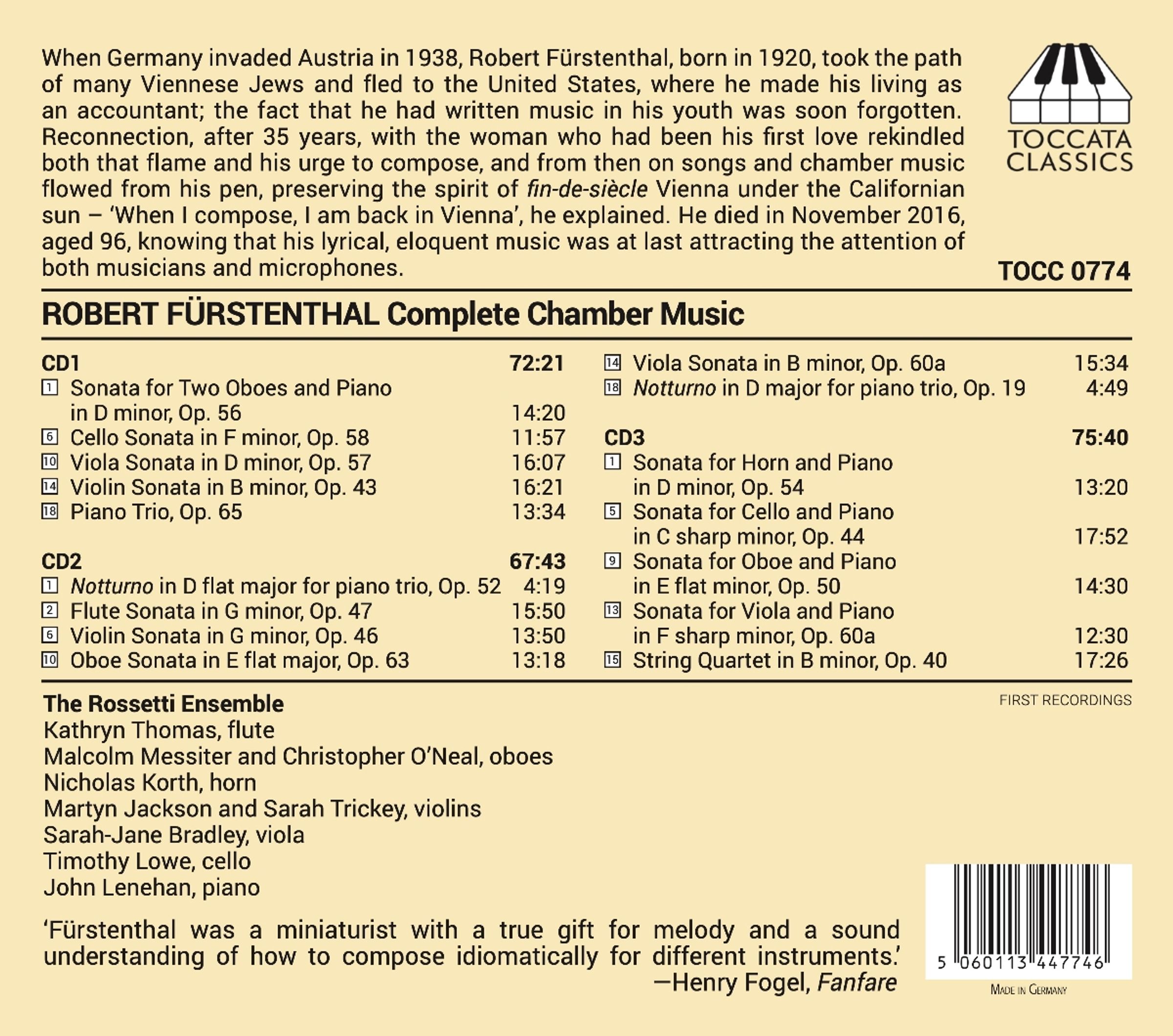 Kammermusik aus seiner Feder, die den Geist des Fin de Siecle in Wien unter der kalifornischen Sonne bewahrten - 'Wenn ich komponiere, bin ich wieder in Wien', erklarte er. Er starb im November 2016 im Alter von 96 Jahren, in dem Wissen, dass seine lyrische, ausdrucksstarke Musik endlich die Aufmerksamkeit von Musikern und Mikrofonen auf sich zog. Erstmals ist mit diesem Dreifach-Album eine Gesamtausgabe der Kammermusik von Robert Furstenthal