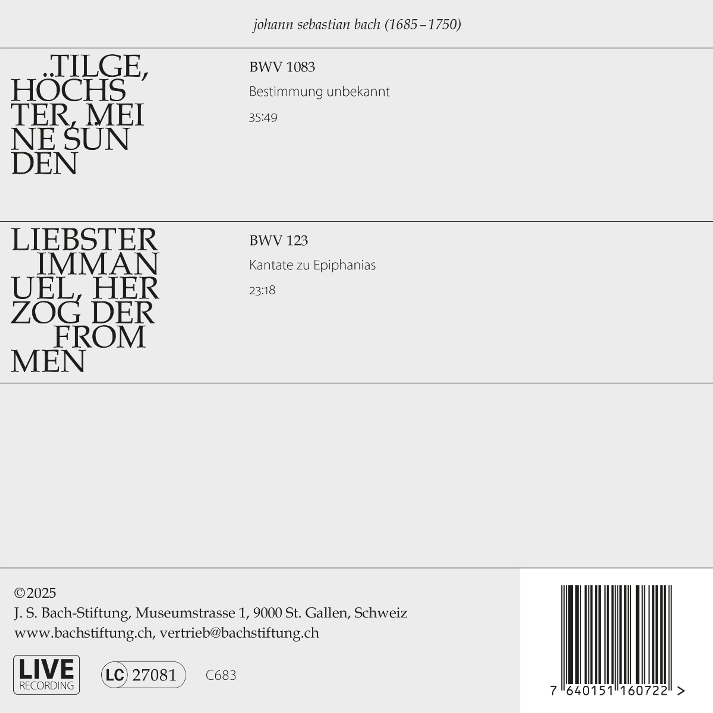 Der 52. Teil der Albumreihe fasst folgende zwei Kantaten zusammen: »Tilge, Höchster, meine Sünden«, BWV 1083 und »Liebster Immanuel, Herzog der Frommen«, BWV 123. Als Solistinnen und Solisten sind Marie Luise Werneburg (Sopran) und Margot Oitzinger (Alt) bei BWV 1083 sowie Laura Kull (Sopran), Daniel Johannsen (Tenor) und Markus Volpert bei BWV 123 zu hören.