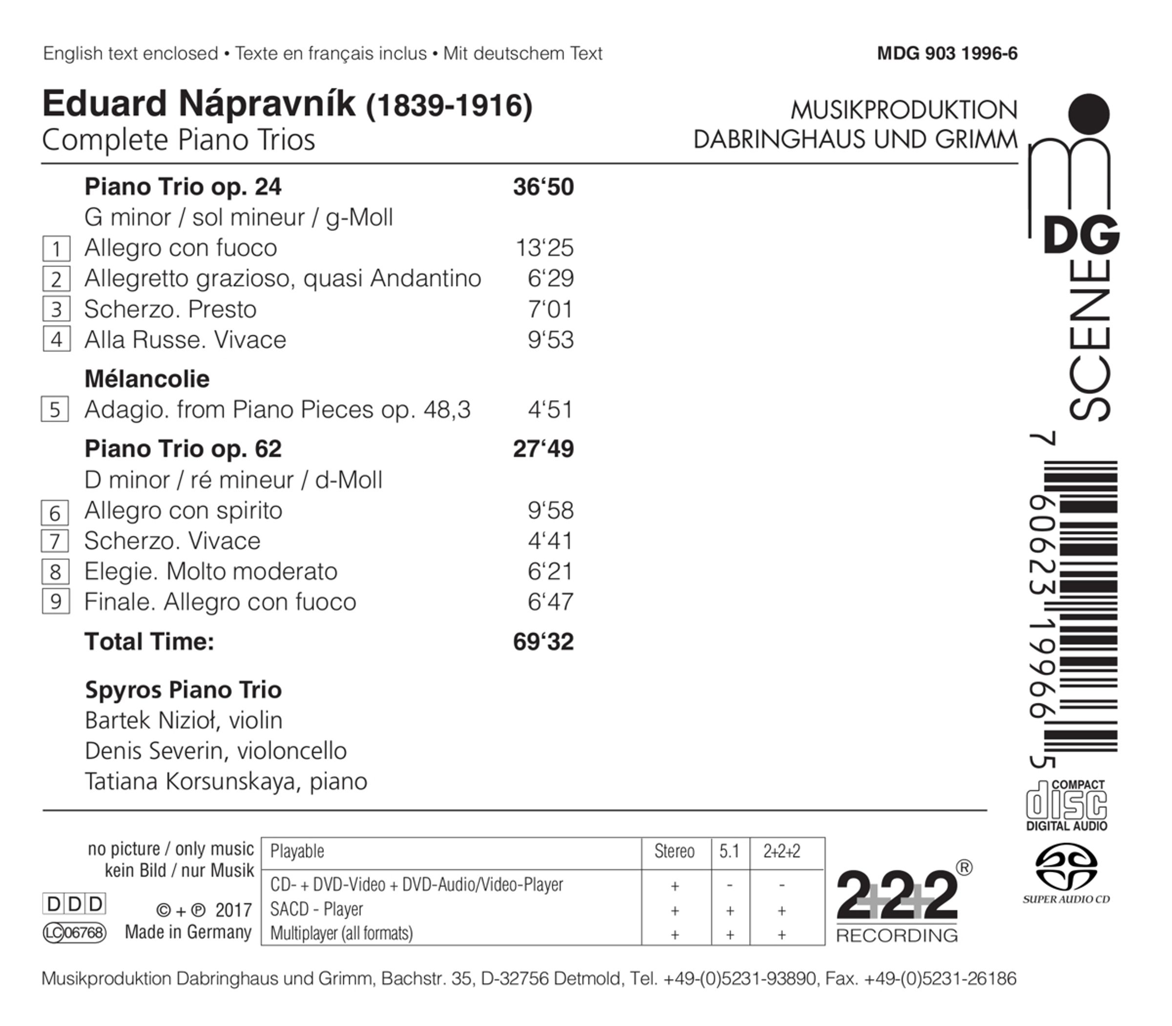 Über fünfzig Jahre lang dirigierte Eduard Nápravník an der Kaiserlichen Oper im Mariinski-Theater zu Sankt Petersburg; der bis heute legendäre Ruf des Theaters geht ganz wesentlich auf die »Ära Nápravník« zurück. Dass der begnadete Orchesterleiter auch ganz vorzüglich zu komponieren wusste, zeigt das Spyros Klaviertrio mit der Ersteinspielung seiner beiden Klaviertrios, auf einer SACD, die jetzt bei MDG erschienen ist.