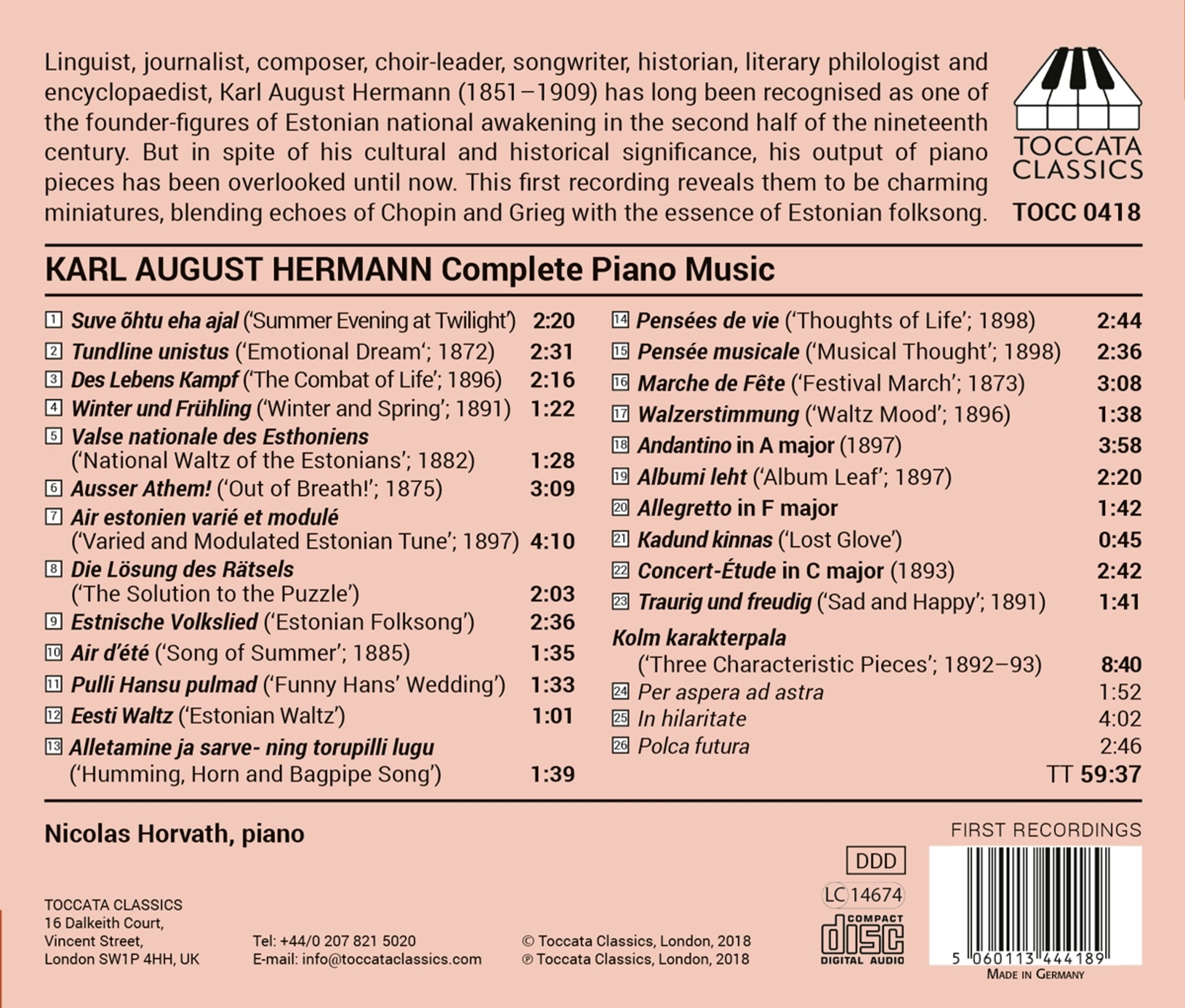 Summer Evening at Twilight; Emotional Dream; The Combat of Life; Winter and Spring; National Waltz of the Estonians; Out of Breath; Varied and Modulated Estonian Tune; The Solution of the Puzzle; Estonian Folksong; Song of Summer; Funny Hans' Wedding; Estonian Waltz; Humming, Horn and Bagpipe Song; Thoughts of Life; Musical Thought; Festival March; Waltz Mood; Andantino A-Dur; Album Leaf; Allegretto F-Dur; Lost Glove; Concert-Etude C-Dur; Traurig und freudig; Three Characteristic Pieces