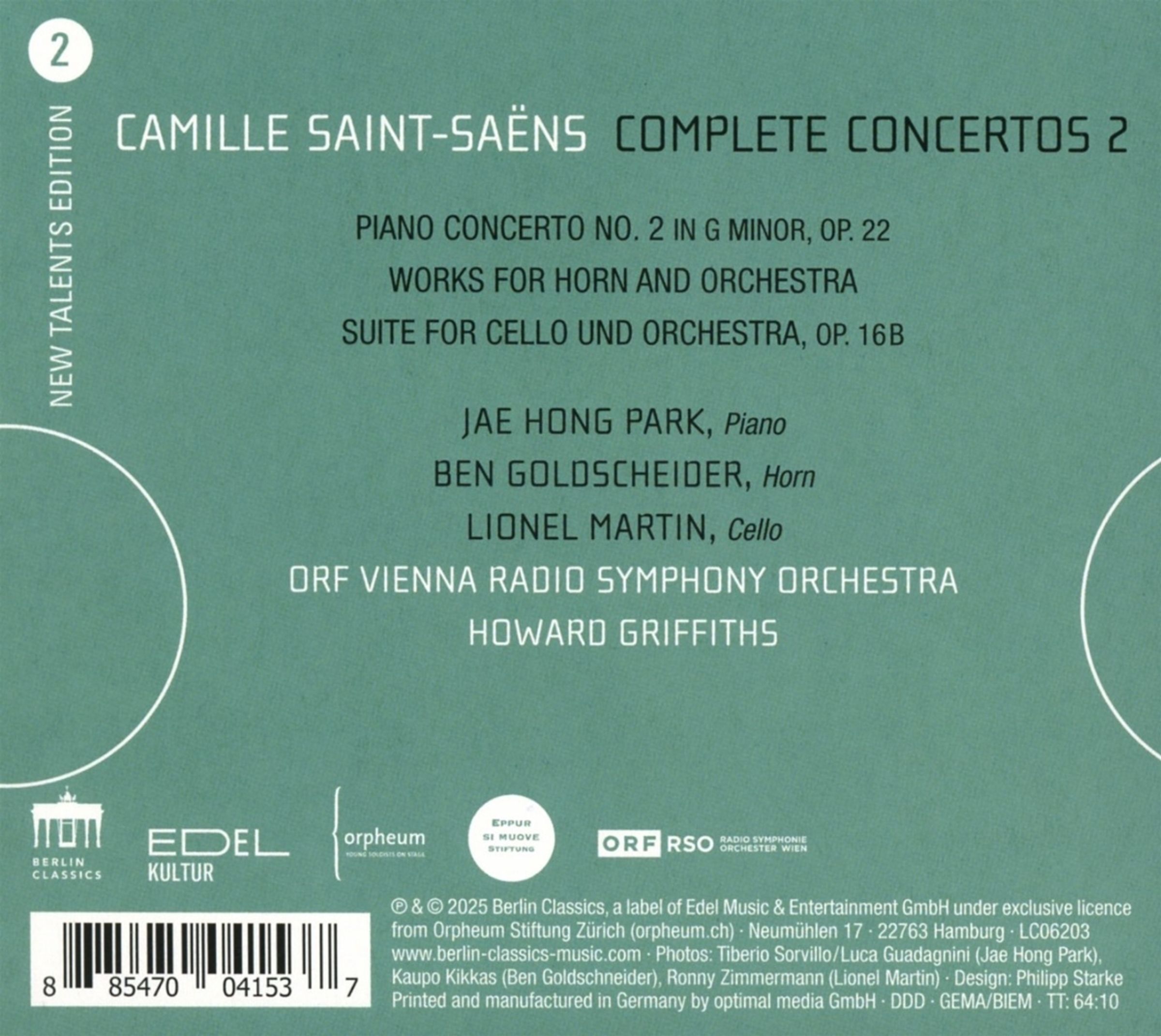 Dies ist das zweite Album der Saint-Saëns-Reihe mit jungen Talenten. Alle Aufnahmen wurden mit dem ORF Radio-Symphonieorchester Wien unter der Leitung von Howard Griffiths gemacht und beinhalten: Klavierkonzert Nr. 2 g-moll op. 22, Morceau de Concert f-moll op. 94, Romanze in F-Dur op. 36, Romanze in E-Dur op. 67 und Suite für Violoncello und Orchester op. 16b