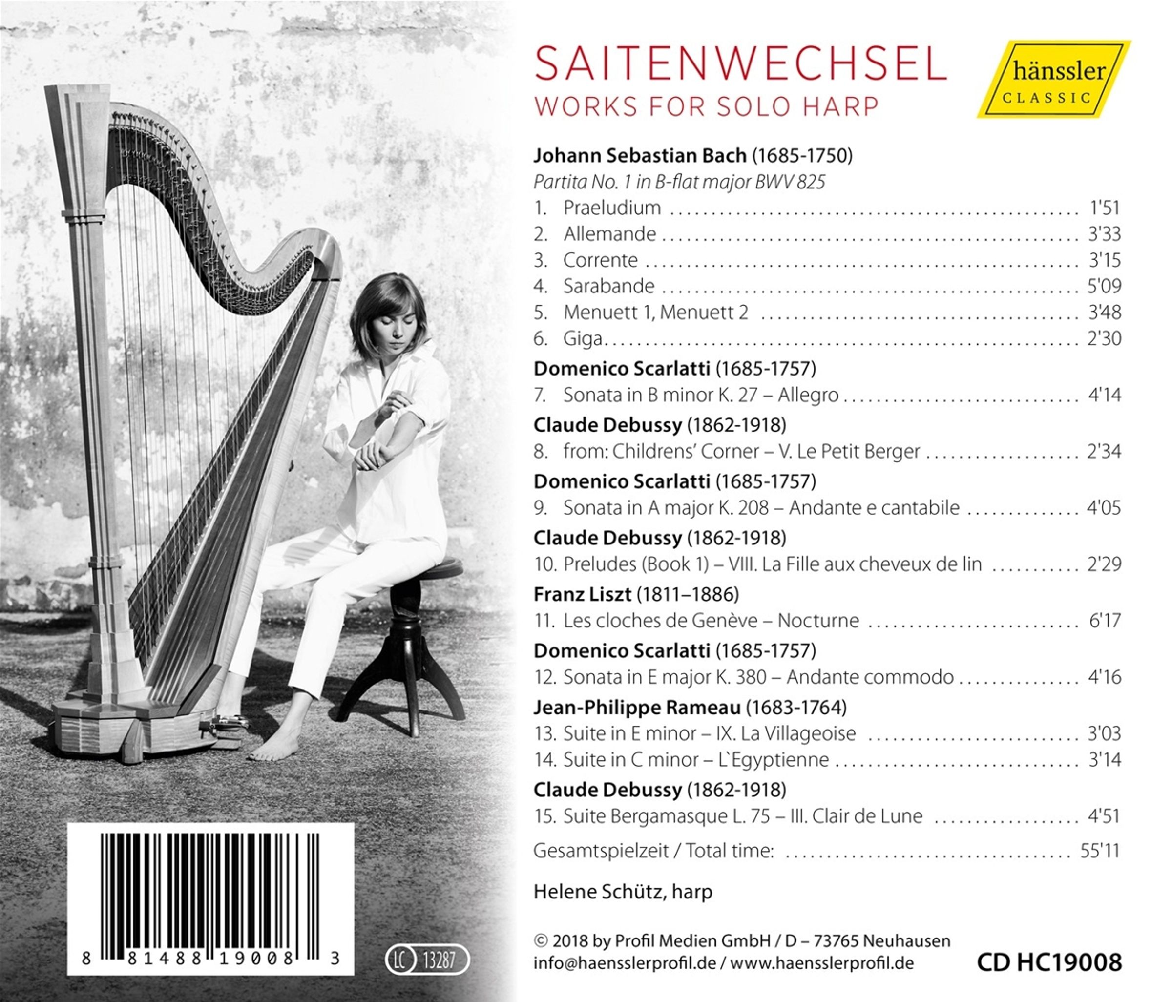 Saitenwechsel - dieses Wortspiel darf man hier ganz konkret verstehen, denn sämtliche auf diesem Album ver sammelten Stücke wurden ursprünglich für Klavier komponiert. Helene Schütz wagt nun im wahrsten Sinne des Wortes einen »Saitenwechsel« und interpretiert sie auf der Harfe. Giemens Matuschek