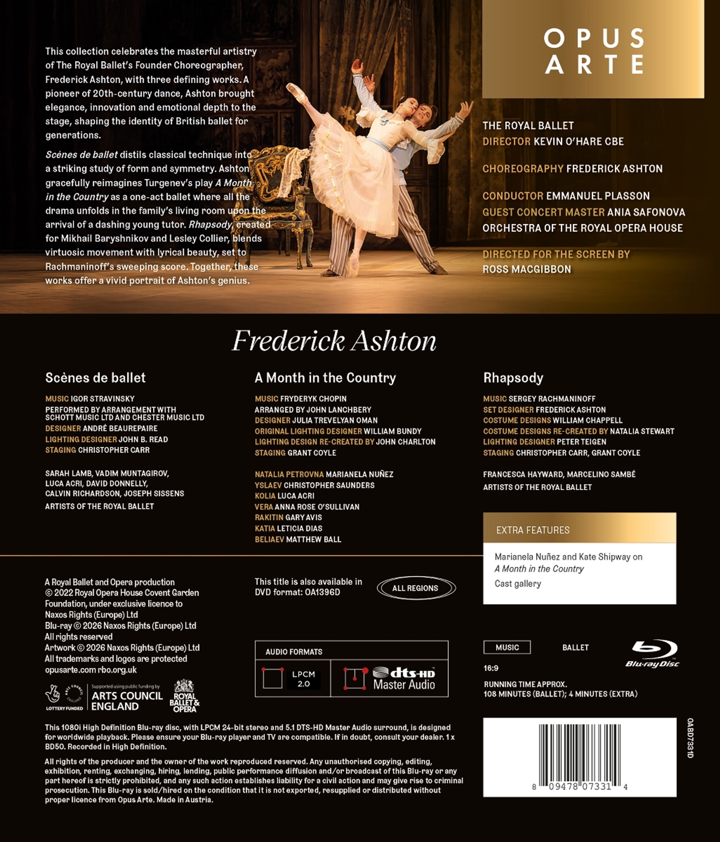 Diese Sammlung feiert die meisterhafte Kunst des Gründerchoreographen des Royal Ballet, Frederick Ashton, mit drei entscheidenden Werken. Als Pionier des Tanzes im 20. Jahrhundert brachte Ashton Eleganz, Innovation und emotionale Tiefe auf die Bühne und prägte die Identität des britischen Balletts für Generationen. "Scenes de ballet" ist eine Tanzmusik-Suite, die Igor Strawinsky im Auftrag des Broadway-Produzenten Billy Rose komponierte. Ashton interpretiert Iwan Turgenjews Theaterstuck "Ein Monat auf dem Lande" anmutig als Einakter, in dem sich das ganze Drama im Wohnzimmer der Familie abspielt, als ein schneidiger junger Lehrer eintrifft. Die Musik stammt von Frederic Chopin. "Rhapsody", das fur Mikhail Baryshnikov und Lesley Collier geschaffen wurde, verbindet virtuose Bewegung mit lyrischer Schönheit zu Sergej Rachmaninoffs schwungvoller Komposition. Zusammen zeichnen diese Werke ein lebhaftes Porträt von Ashtons Genie.