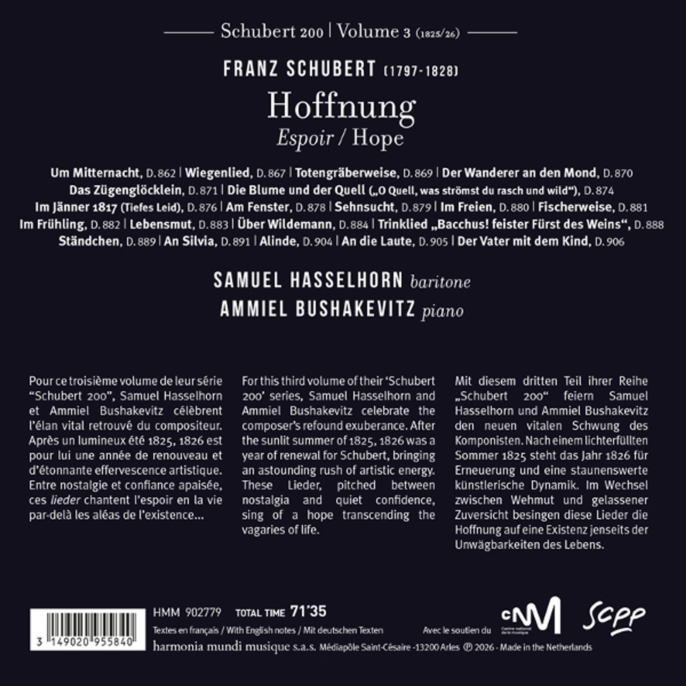 Mit diesem dritten Teil ihrer Reihe „Schubert 200“ feiern Samuel Hasselhorn und Ammiel Bushakevitz den neuen vitalen Schwung des Komponisten. Nach einem lichterfüllten Sommer 1825 steht das Jahr 1826 für Erneuerung und eine staunenswerte künstlerische Dynamik. Im Wechsel zwischen Wehmut und gelassener Zuversicht besingen diese Lieder die Hoffnung auf eine Existenz jenseits der Unwägbarkeiten des Lebens.