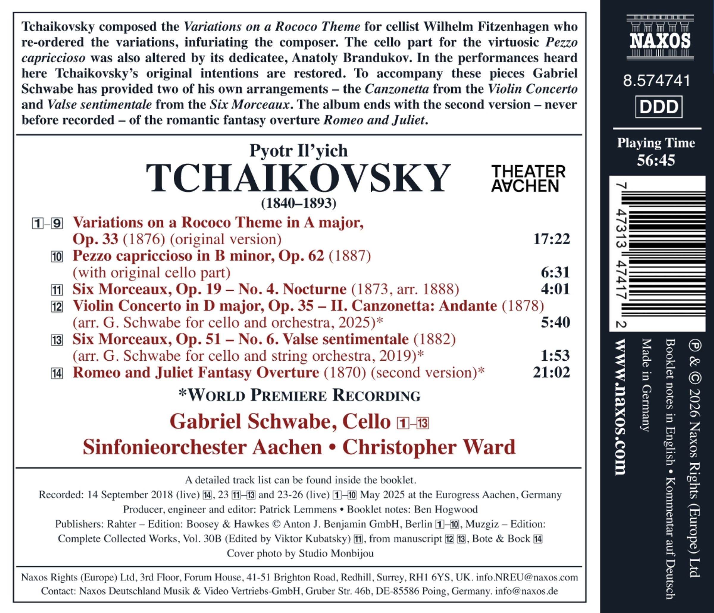 Pjotr Tschaikowski komponierte die »Variationen über ein Rokoko-Thema« für den Cellisten Wilhelm Fitzenhagen, der die Variationen neu bestellte, was den Komponisten verärgerte. Auch die Cellostimme für das virtuose »Pezzo capriccioso« wurde von seinem Widmungsträger Anatoli Brandukow verändert. In den hier zu hörenden Aufführungen werden Tschaikowskis ursprüngliche Absichten wiederhergestellt. Gabriel Schwabe hat zu diesen Stücken zwei seiner eigenen Bearbeitungen beigesteuert - die »Canzonetta «aus dem Violinkonzert und die »Valse sentimentale« aus den »Sechs Morceaux«. Das Album endet mit der zweiten, nie zuvor aufgenommenen Version der romantischen Fantasie-Ouvertüre »Romeo und Julia«. Gabriel Schwabe ist Preisträger dreier ausnehmend renommierter Cello-Wettbewerbe: dem Grand Prix Emanuel Feuermann in Berlin, dem Concours Rostropovich in Paris und dem Pierre Fournier Award in London. Als Solist arbeitete er mit namhaften internationalen Orchestern sowie weltberühmten Dirigenten zusammen. Christopher Ward dirigiert das Sinfonieorchester Aachen bei dieser Aufnahme.