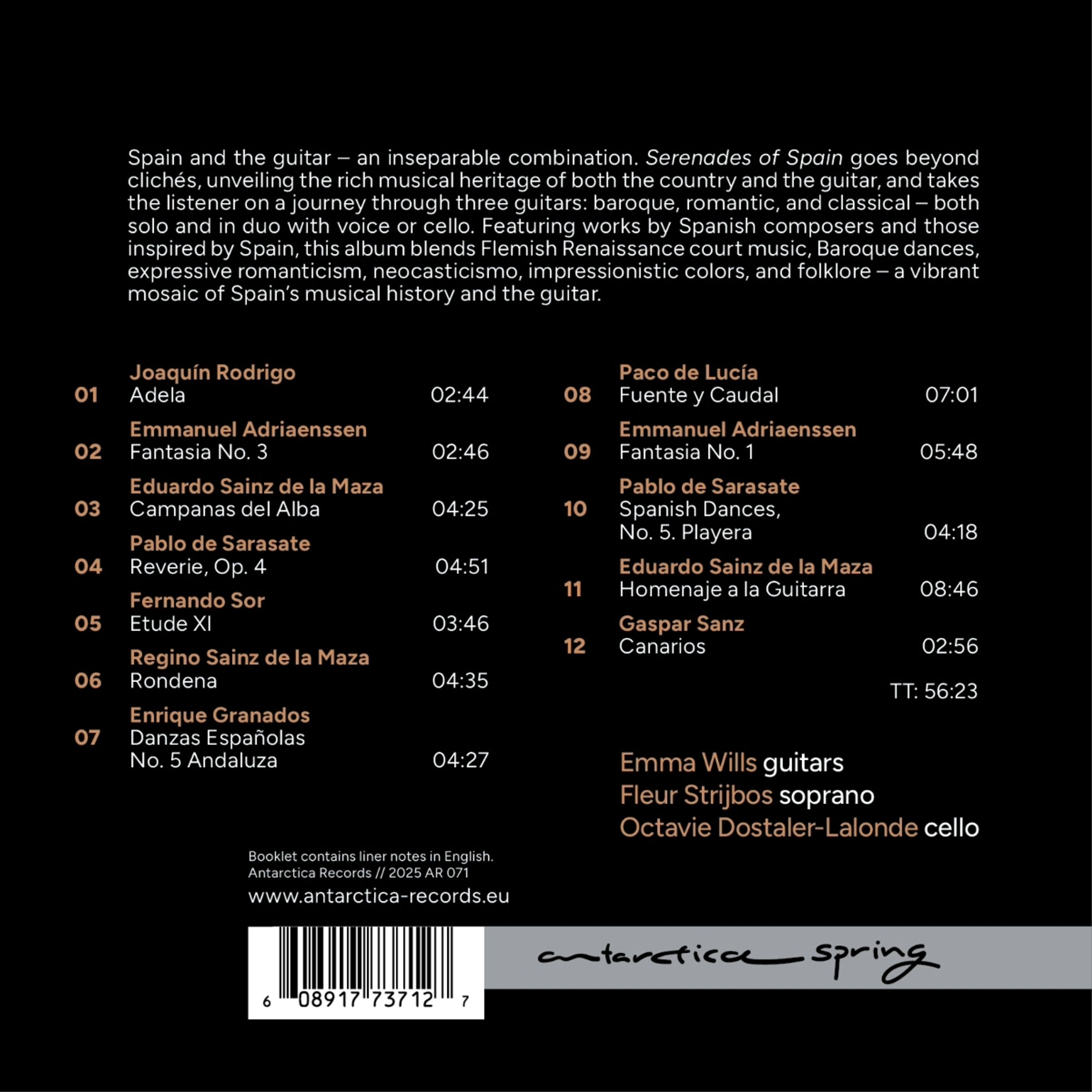 Spanien und die Gitarre – eine untrennbare Verbindung. Serenades of Spain geht über Klischees hinaus, enthüllt das reiche musikalische Erbe des Landes und der Gitarre und nimmt den Zuhörer mit auf eine Reise durch drei Gitarren: Barock, Romantik und Klassik – sowohl solo als auch im Duo mit Gesang oder Cello. Mit Werken spanischer Komponisten und von Spanien inspirierten Musikern verbindet dieses Album flämische Renaissance-Hofmusik, Barocktänze, expressive Romantik, Neocasticismo, impressionistische Farben und Folklore – ein lebendiges Mosaik der spanischen Musikgeschichte und der Gitarre.