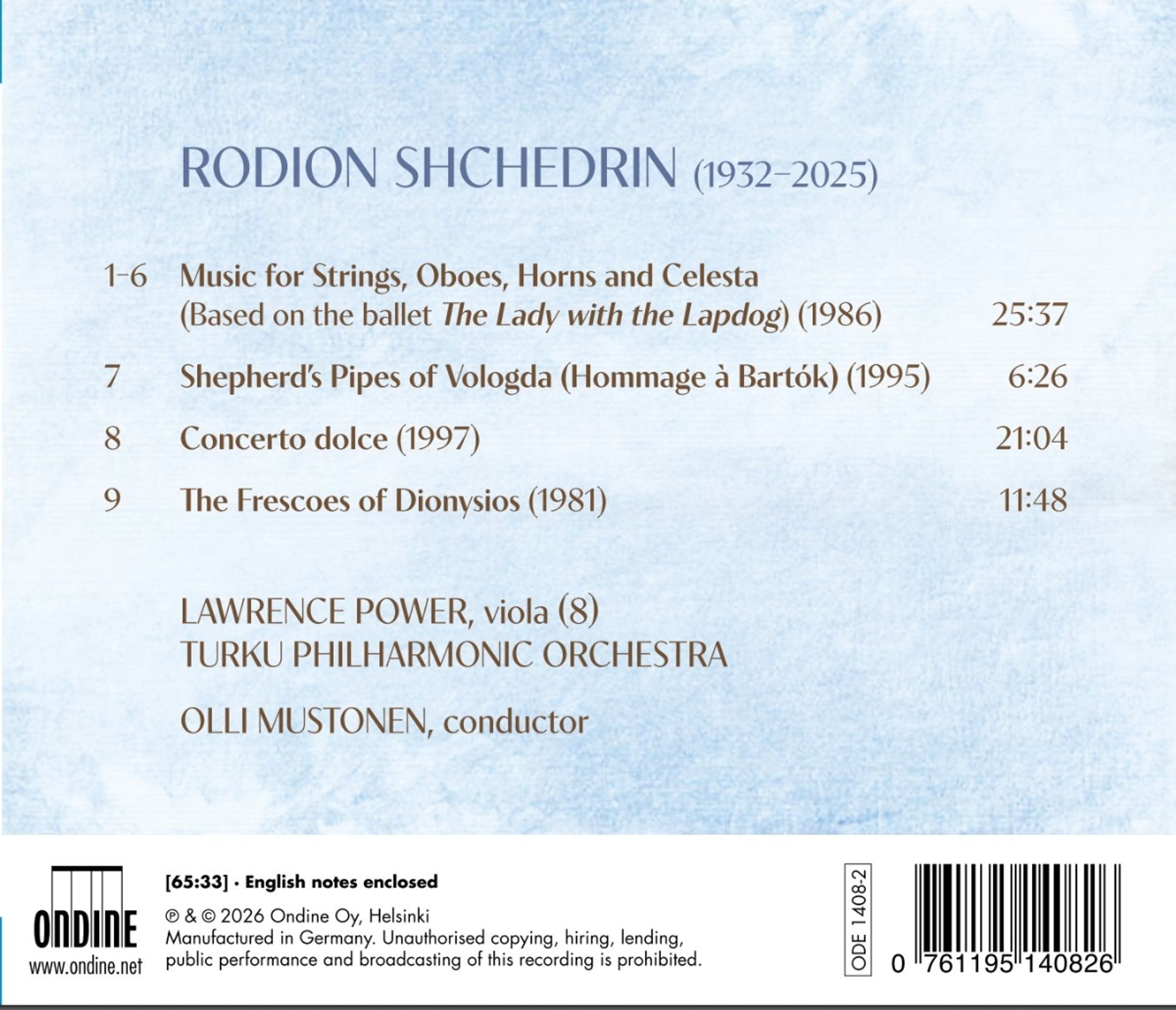 Der Komponist Rodion Schtschedrin (1932-2025) war eine der führenden Persönlichkeiten der sowjetischen Musik der Nachkriegszeit. Dieses Album des Turku Philharmonic Orchestra unter der Leitung von Olli Mustonen vereint vier seiner Werke, darunter Musik aus seinem Ballett "Dame mit Hündchen" sowie ein Violakonzert, "Concerto dolce", gespielt von Lawrence Power, einem der größten Bratschisten unserer Zeit. Rodion Schtschedrin verstarb, während dieses Album aufgenommen wurde - so wird es zu einem Denkmal für die einzigartige, rund dreißigjährige Freundschaft und künstlerische Zusammenarbeit zwischen Olli Mustonen und Schtschedrin. Schtschedrin bewegte sich frei zwischen verschiedenen Stilen und kombinierte Einflüsse und Materialien aus verschiedenen Quellen, er selbst bezeichnete sich als "Post-Avantgardisten". Schtschedrins fünf Ballette machen ihn zu einem vollwertigen Erben der russischen Balletttradition, die er gleichzeitig reformierte. "Dame mit Hündchen" war sein letztes vollständiges Ballett, und er schrieb es zum 60. Geburtstag seiner Frau. Das Konzertstück ist ebenso konzertiert wie das Originalballett. "Shepherd's Pipes of Vologda" (1995) wurde vom ungarischen Rundfunk in Auftrag gegeben und ist eine Hommage an den ungarischen Meisterkomponisten Bela Bartok - auch Schtschedrin reiste nach Weißrussland und Wologda, um Volksmusik zu studieren und aufzunehmen. Der international renommierte Bratschist Lawrence Power ist in den letzten zehn Jahren regelmäßig als Gastmusiker bei Orchestern von höchstem Niveau aufgetreten, aber auch als Kammermusiker ist er sehr gefragt. Die Turku Musical Society, aus der später das Turku Philharmonic Orchestra hervorging, wurde 1790 gegründet und ist somit eines der ältesten der Welt. Olli Mustonen nimmt in der heutigen Musikszene eine einzigartige Stellung ein. In der Tradition großer Meister wie Sergei Rachmaninow verbindet er die Rollen seines musikalischen Schaffens als Komponist, Pianist und Dirigent in großer Ausgewogenheit und vereint sie oft in einer faszinierenden Dreifachrolle.