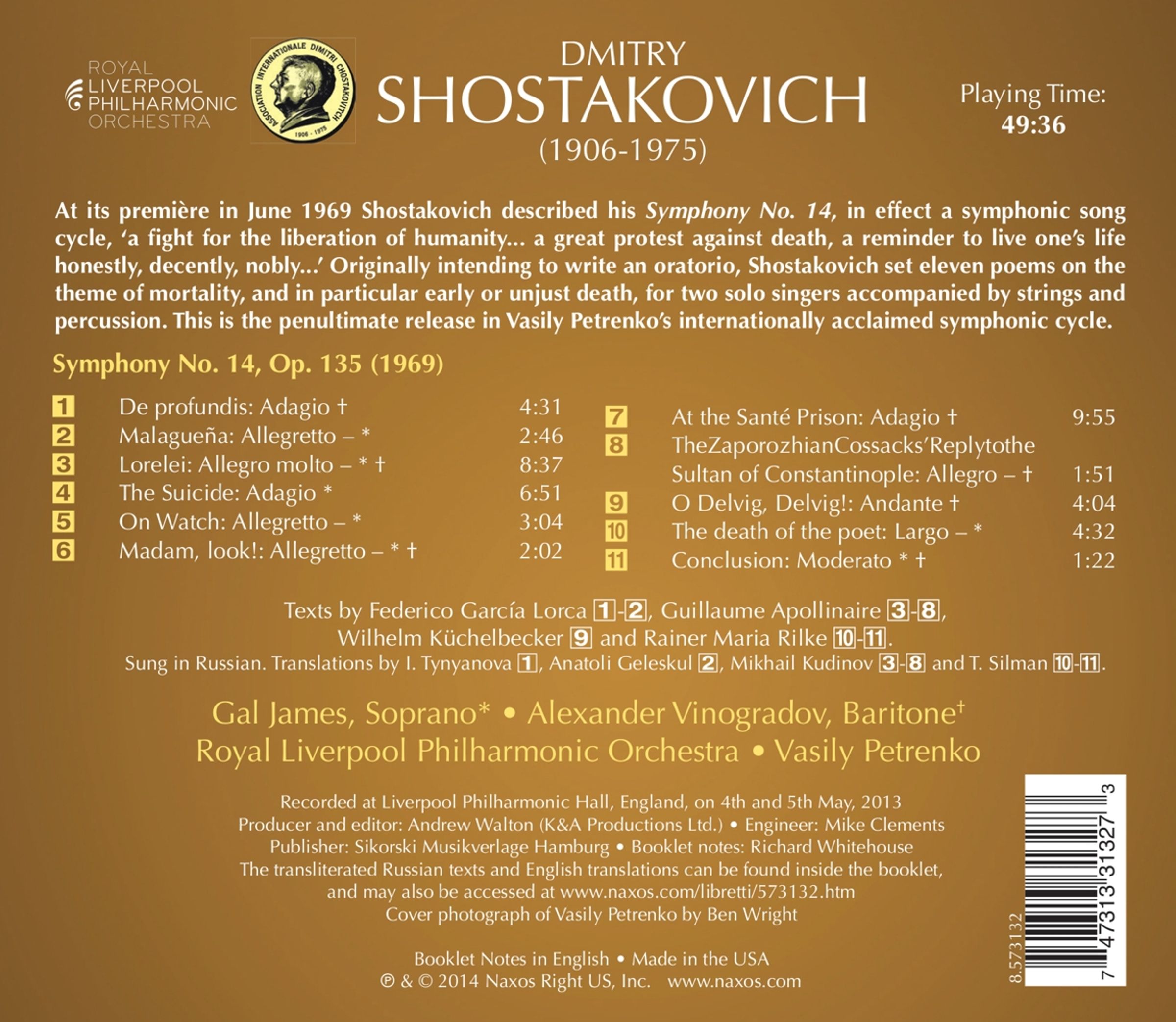 Doch im Gegensatz zu zahlreichen Klassikern verklärt Schostakowitsch den Tod in keiner Weise: Mit elf Gedichten, die den Tod, besonders den ungerechten oder zu frühen, thematisieren, protestiert Schostakowitsch auf das Schärfste gegen das Ende des Lebens, das uns allen bevorsteht und erinnert an die Tugenden, die es im Leben zu beachten gilt: Ehrlichkeit, Anstand und Großherzigkeit. »Braucht die Welt überhaupt ›noch einen‹ Schostakowitsch-Zyklus? Den von Petrenko aus Liverpool auf jeden Fall!« (Image-Hifi über 8.573188, Sinfonie Nr. 4)