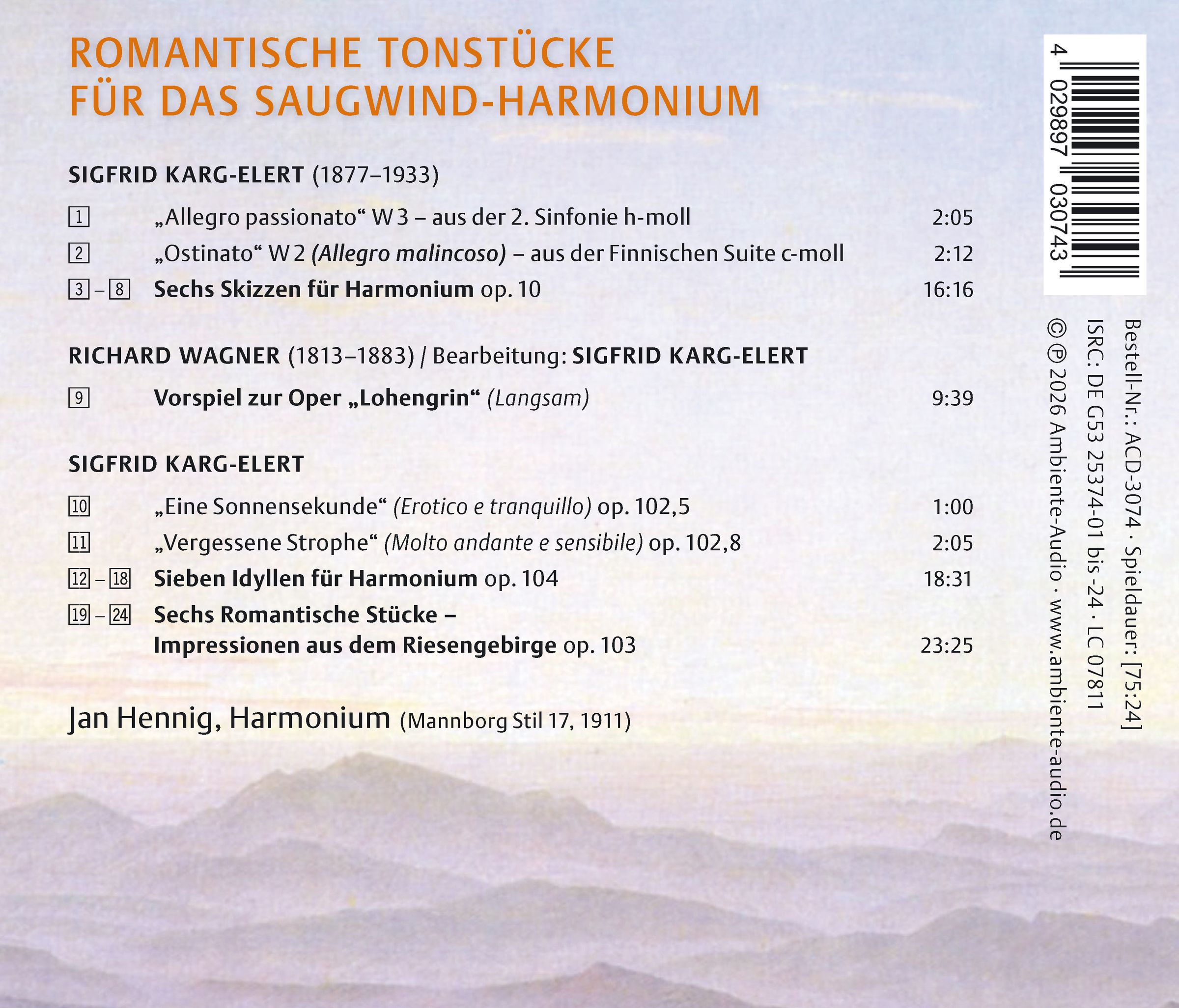 Allegro passionato aus Symphonie Nr. 2 h-moll; Ostinato aus Finnische Suite c-moll; 6 Skizzen für Harmonium op. 10; Eine Sonnensekunde op. 102 Nr. 5; Vergessene Strophe op. 102 Nr. 8; 7 Idyllen für Harmonium op. 104; 6 Romantische Stücke op. 103 "Impressionen aus dem Riesengebirge"