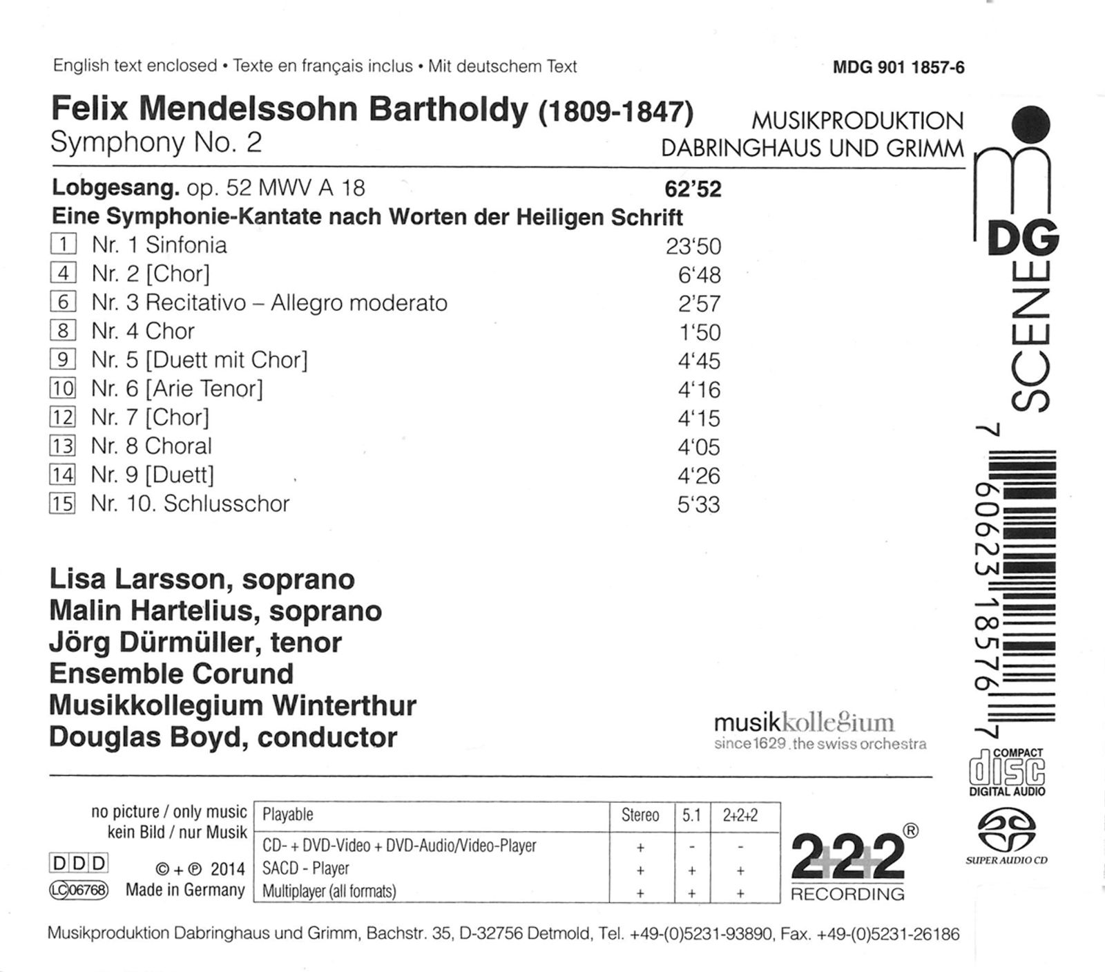 - In MDGs dreidimensionaler 2+2+2Aufnahme, mit allerfeinster SACDTechnik aufgezeichnet, kommt Mendelssohns zweite monumentale (Chor)Sinfonie hier in seiner Konzertatmosphäre besonders gut zur Geltung