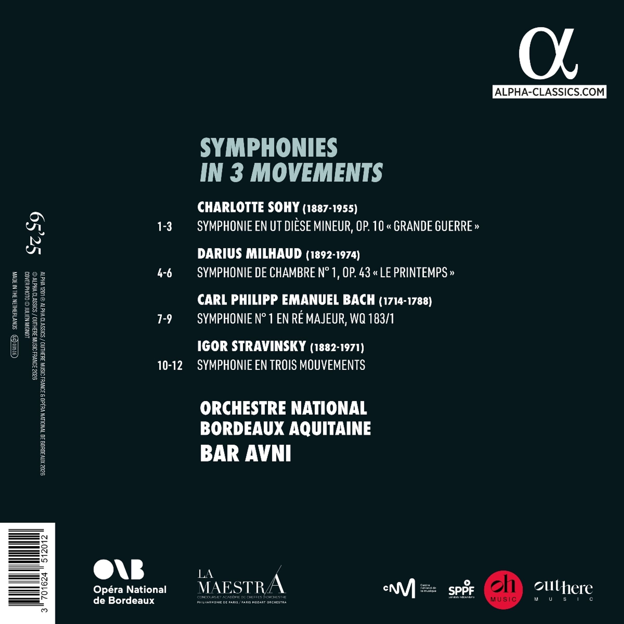 Die Dirigentin Bar Avni, Gewinnerin des La Maestra-Wettbewerbs 2024 in Paris und Trägerin von vier weiteren Preisen, verfolgt eine äußerst vielversprechende Karriere. Die in Israel geborene Musikerin studierte zunächst Schlagzeug, bevor sie sich dem Dirigieren zuwandte. Zu ihren Mentoren zählen Yoav Talmi, Barbara Hannigan und Ayelet Geva; außerdem hat sie Dirigenten wie Gustavo Dudamel, Klaus Mäkelä und Myung-Whun Chung assistiert. Avni ist bekannt dafür, dass sie gezielt Programme abseits ausgetretener Pfade sucht. Das zeigt sich auch auf ihrer ersten Aufnahme mit dem Orchestre National Bordeaux Aquitaine, die Musik von Charlotte Sohy, Darius Milhaud, Carl Philipp Emanuel Bach und Igor Stravinsky vereint. Das Programm eröffnet Sohys Sinfonie »Grande Guerre«, die 1914 entstand, aber erst 2019 uraufgeführt wurde. Milhaud komponierte 1917 seine erste der sechs Petites Symphonies, während er Sekretär des französischen Botschafters in Brasilien, Paul Claudel, war. Die sprühende Sinfonie von C. P. E. Bach aus dem Jahr 1775 leitet über zum abschließenden Werk von Stravinsky – seiner ersten großen Komposition nach der Übersiedlung in die USA um 1940, der Sinfonie in drei Sätzen… Drei Sätze, das ist der rote Faden, der sich durch die Werke dieser sinfonischen Reise zieht.