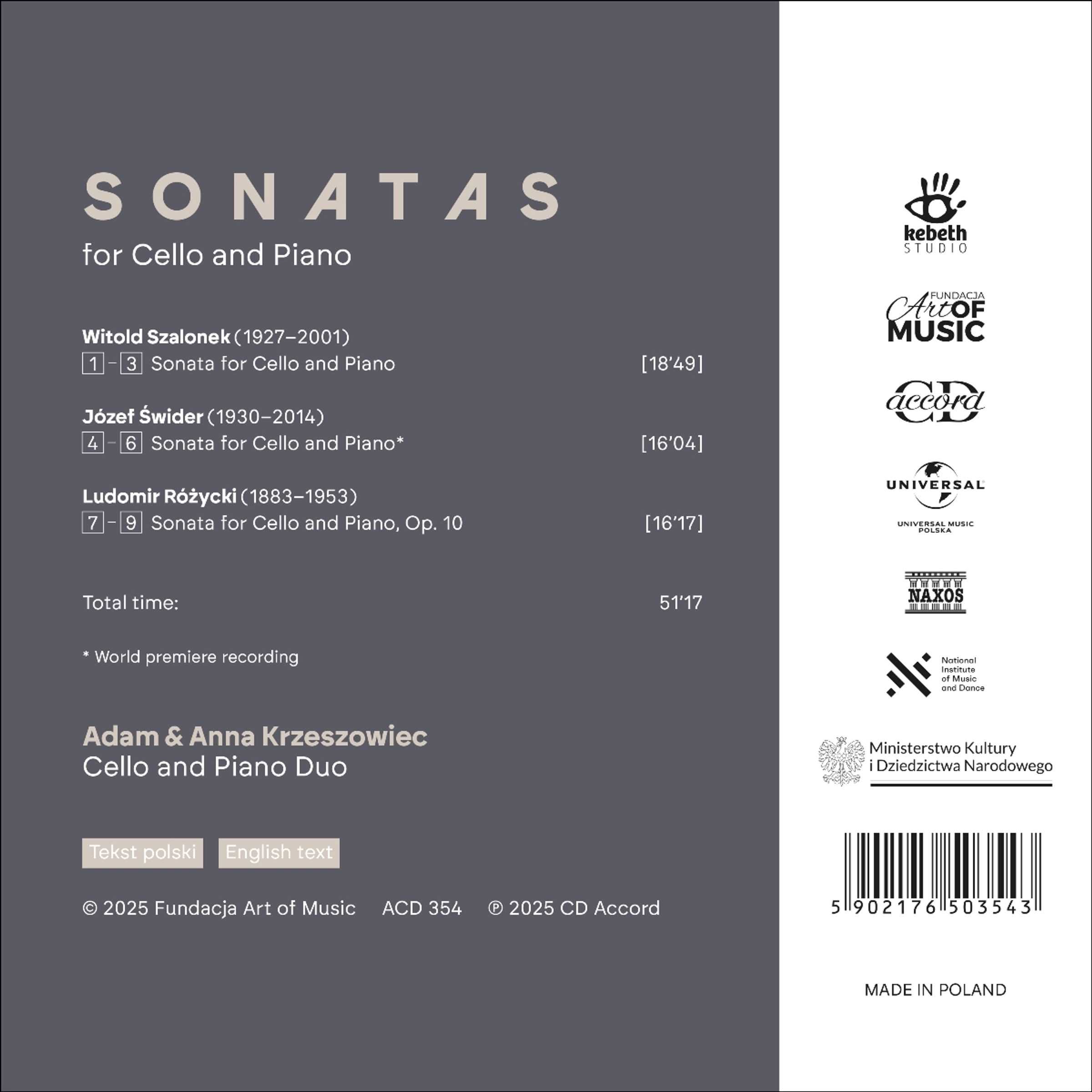 Anna und Adam Krzeszowiec bilden ein musikalisches und privates Duo, was sich in einer tiefen künstlerischen Synergie und musikalischer Verständigung äußert und zu sensiblen und leidenschaftlichen künstlerischen Kreationen führt. Auf diesem neuen Album präsentieren sie Sonaten von Witold Szalonek, Józef Swider und Ludomir Rózycki, allesamt aus dem 20. Jahrhundert.
