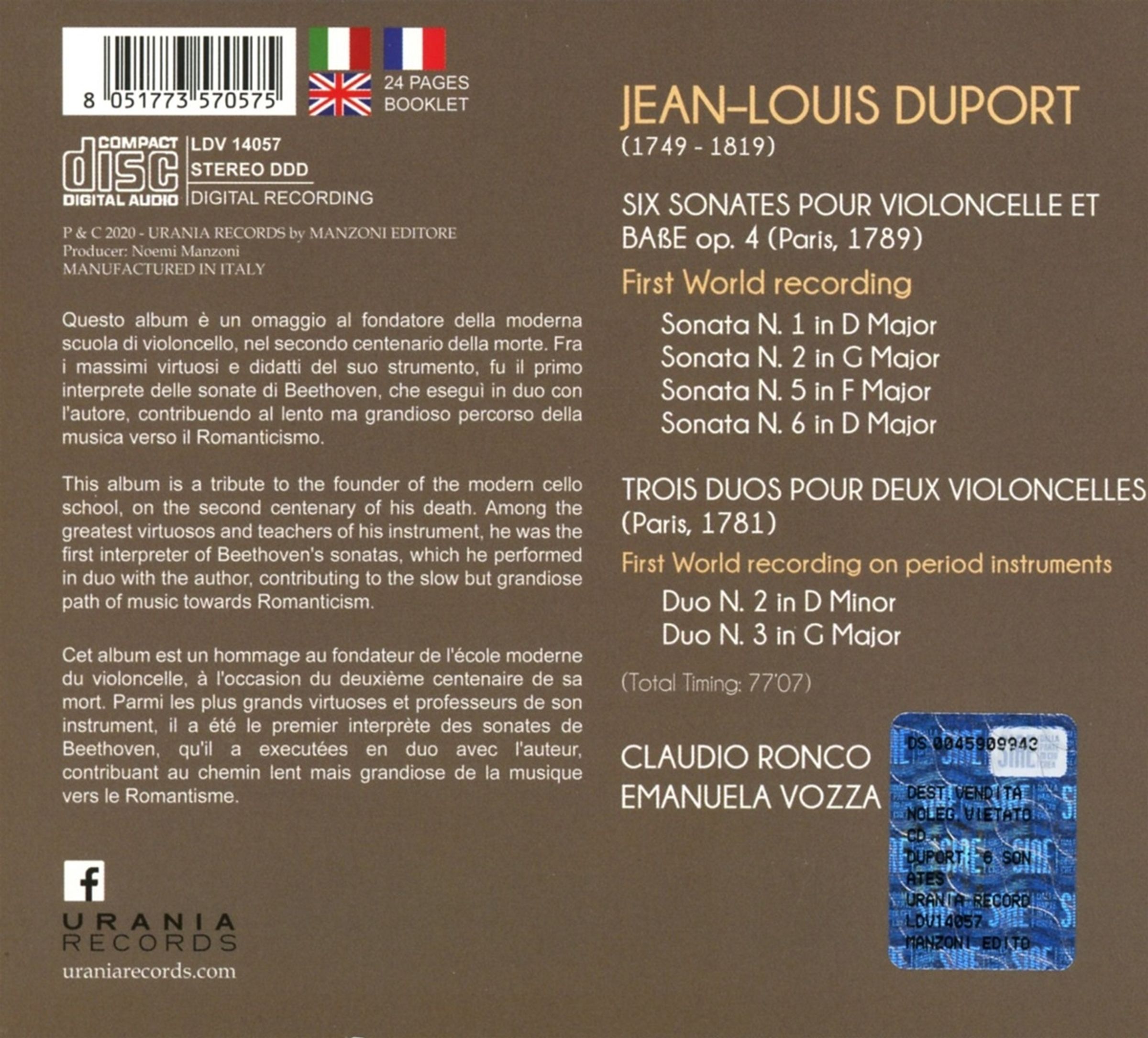 Jean-Louis Duport: Sonaten für Cello & Bc op.4 Nr.1,2,5,6 auf CD
