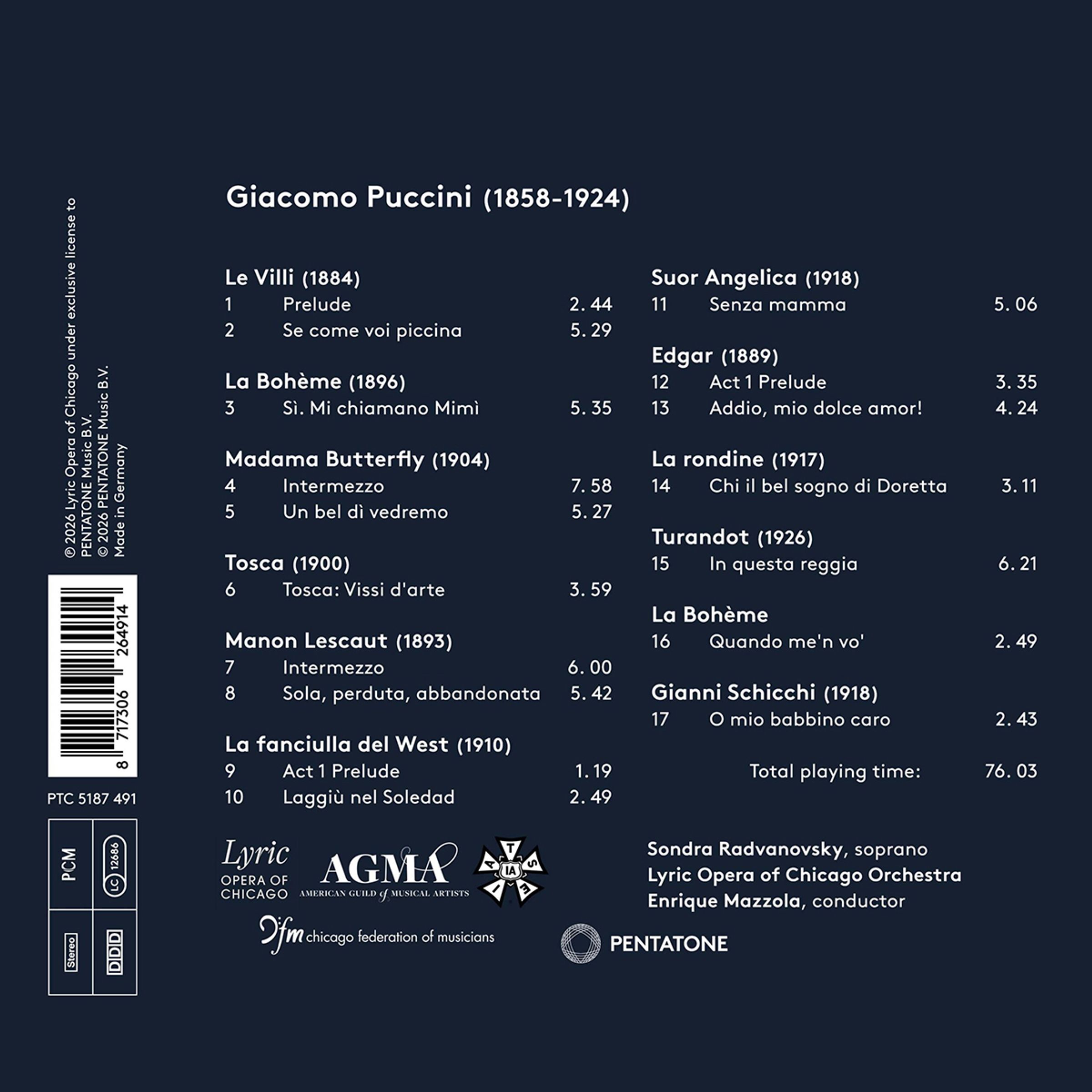 Giacomo Puccini: Prelude & Se come voi piccina aus LeVilli; Si. Mi chiamano Mimi & Quando me'n vo aus La Boheme; Intermezzo & Un bel di vedremo aus Madama Butterfly; Intermezzo & Sola, perduta, abbandonata aus Manon Lescaut; Prelude zum 1. Akt & Laggiu nel Soledad aus La Fanciulla del West; Senza mamma aus Suor Angelica; Prelude zum 1. Akt & Addio, mio dolce amor aus Edgar: Chi il bel sogno di Doretta aus La Rondine; In questa reggia aus Turandot; O mio babbino caro aus Gianni Schicchi