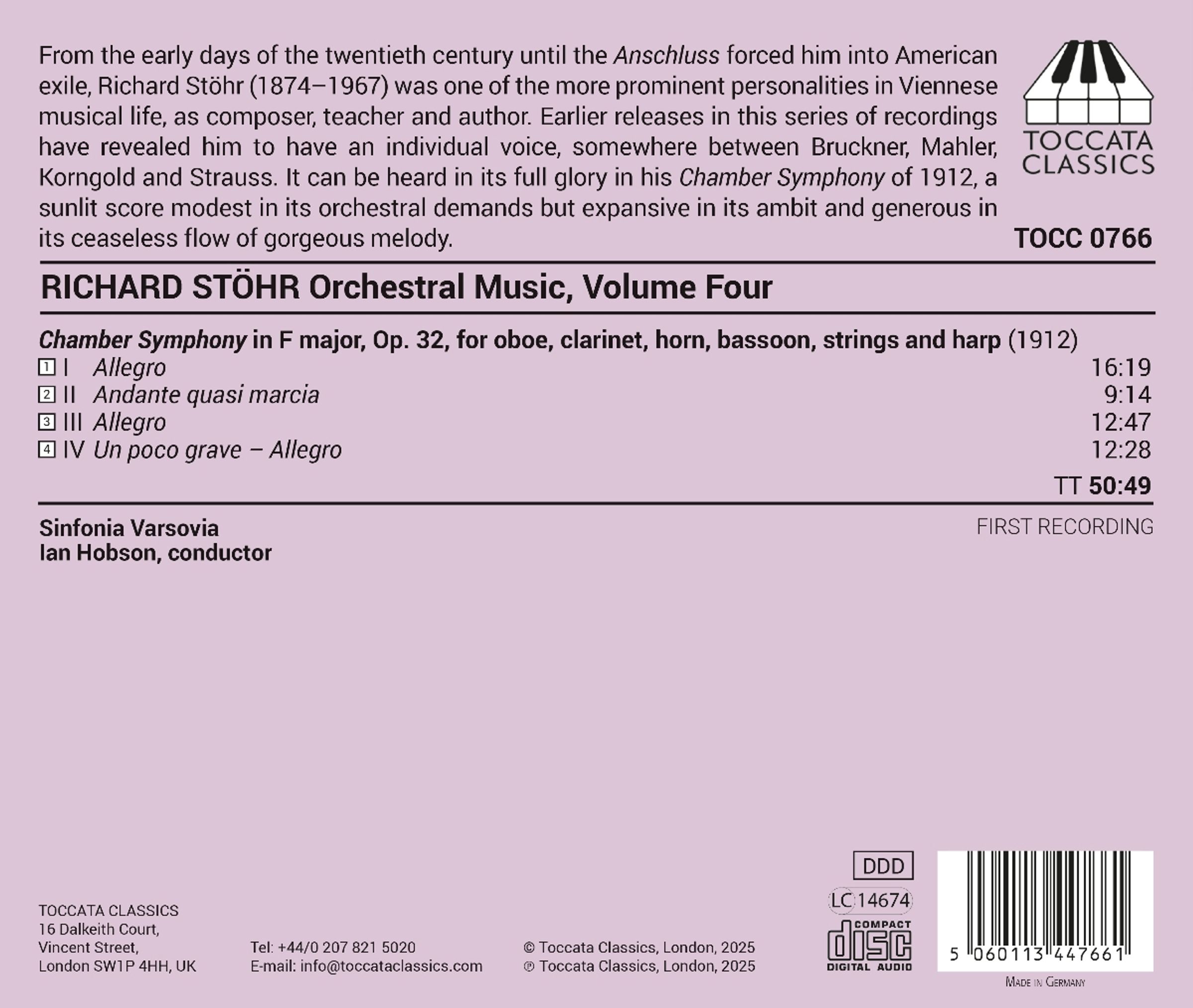 Von den Anfängen des 20. Jahrhunderts bis zum sogenannten "Anschluss", der ihn ins amerikanische Exil zwang, war Richard Stöhr als Komponist, Lehrer und Autor eine der prominentesten Persönlichkeiten des Wiener Musiklebens. Frühere Veröffentlichungen dieser Aufnahmeserie haben bereits enthüllt, dass er einen ganz eigenen Stil hatte, irgendwo zwischen Bruckner, Mahler, Korngold und Strauss. Dieser kommt in seiner ganzen Pracht in seiner Kammersinfonie von 1912 zum Ausdruck, einer lichtdurchfluteten Partitur, die orchestral zwar bescheiden, aber dennoch weitreichend und großzügig in ihrem unaufhörlichen Fluss wunderschöner Melodien ist.