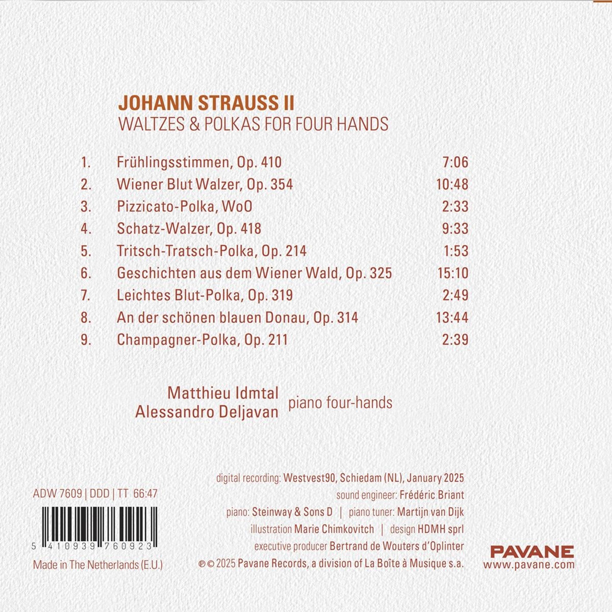 Diese Aufnahme, die anlässlich des 200. Geburtstags von Johann Strauss II. veröffentlicht wurde, ist eine Hommage an diese lebendige, aber oft vergessene Tradition des Musizierens im 19. Jahrhundert. Sie bietet eine Auswahl der bekanntesten Kompositionen von Strauss in diesen originalen vierhändigen Bearbeitungen, einer heute weitgehend vergessenen Kunstform, die einst ein Eckpfeiler des Musizierens im 19. Jahrhundert war. Die Pianisten Alessandro Deljavan und Matthieu Idmtal erweisen sich als ideale Interpreten dieser Musik und fangen ihren wesentlichen Geist perfekt ein: anmutig, spontan, humorvoll und elegant tänzerisch.